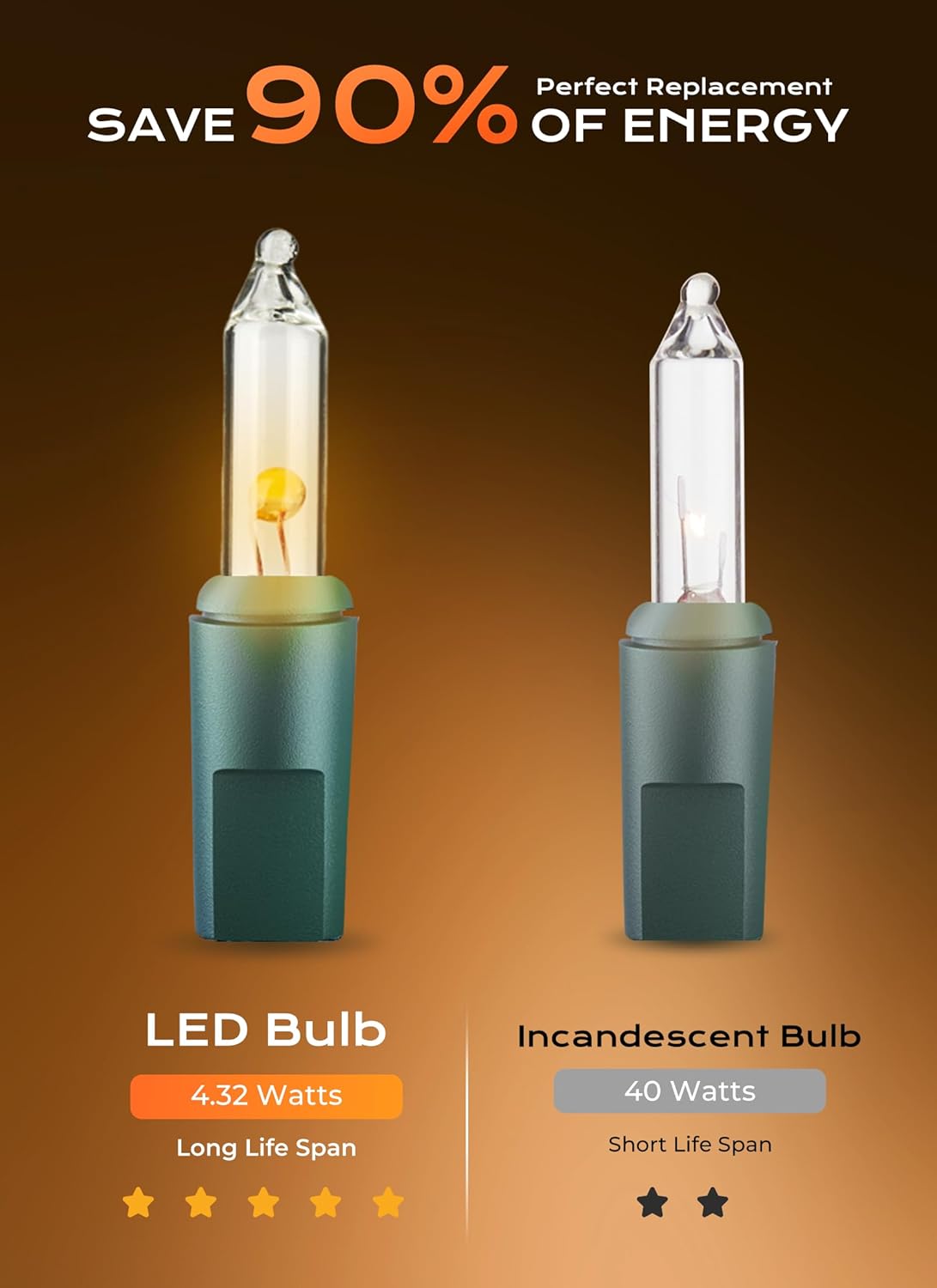 - [Mini Christmas Lights Set] Christmas lights on green wire set includes 50 count transparent LED mini-lights, 16 feet green wires, and each bulb is 4 inches apart, 24 inches lead wire, 4 inches end connector. Christmas String light sets come with 2 spare fuses and 2 spare bulbs for easy replacement. This mini Christmas light can be connected end to end and can be extended to a longer connection length, making it be suitable for different decoration needs