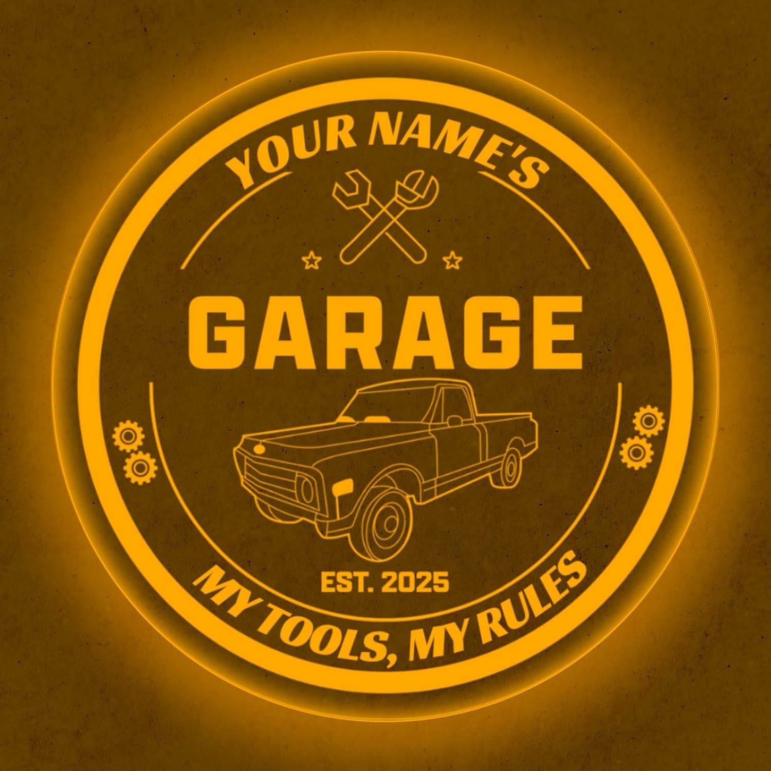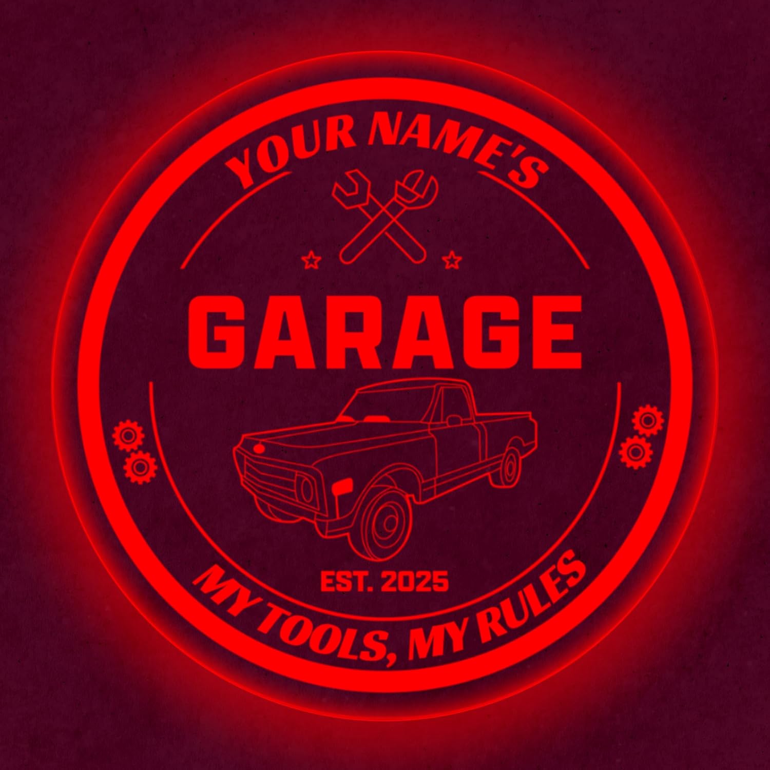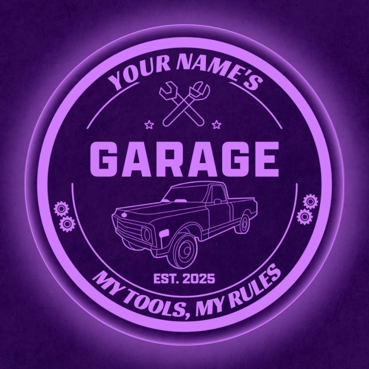 - Personalized Garage Truck Sign with LED Lights: Add your name, shop name, or fun phrase to this laser engraved acrylic sign with bright color changing LEDs for a bold garage or workshop vibe