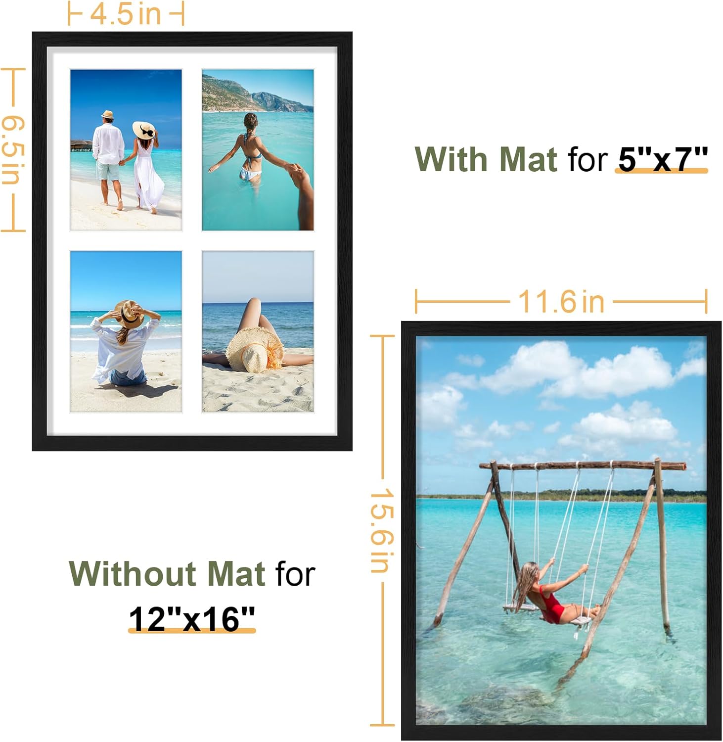 - Perfect Photo Fit: The 12x16 collage frame holds four 4x6 photos with mat or one 12x16 photo without mat. Each 4x6 opening is designed 0.5 inches smaller for a secure grip in this classic black frame