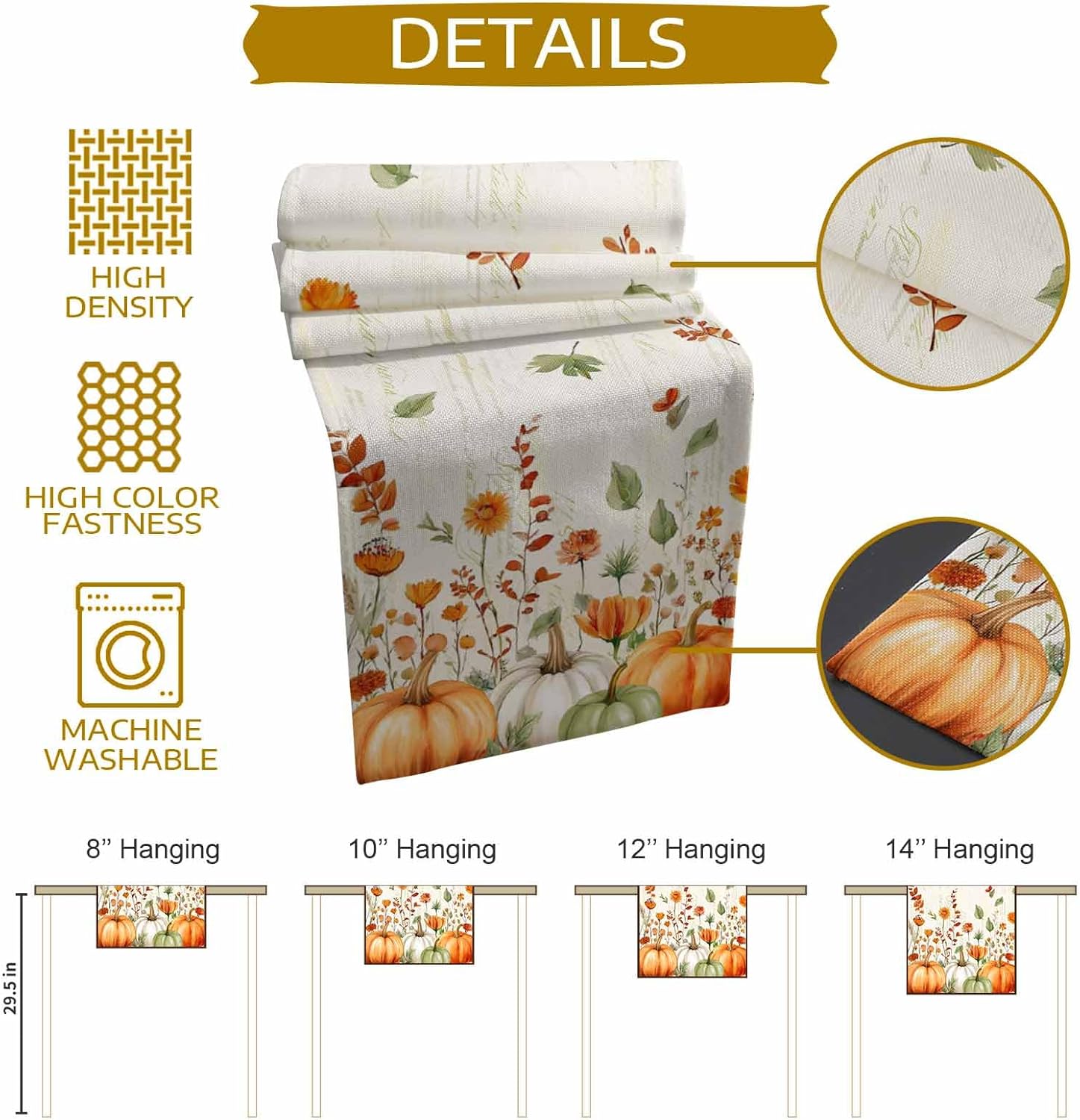 Fall Wildflowers Cotton Linen Table Runner for Dining Kitchen, Thanksgiving Pumpkin Outdoor Party Rustic Tablerunners Decoration, Botanical Floral Vintage Dresser Scarf Tablecloth Runners 13x72 Inches