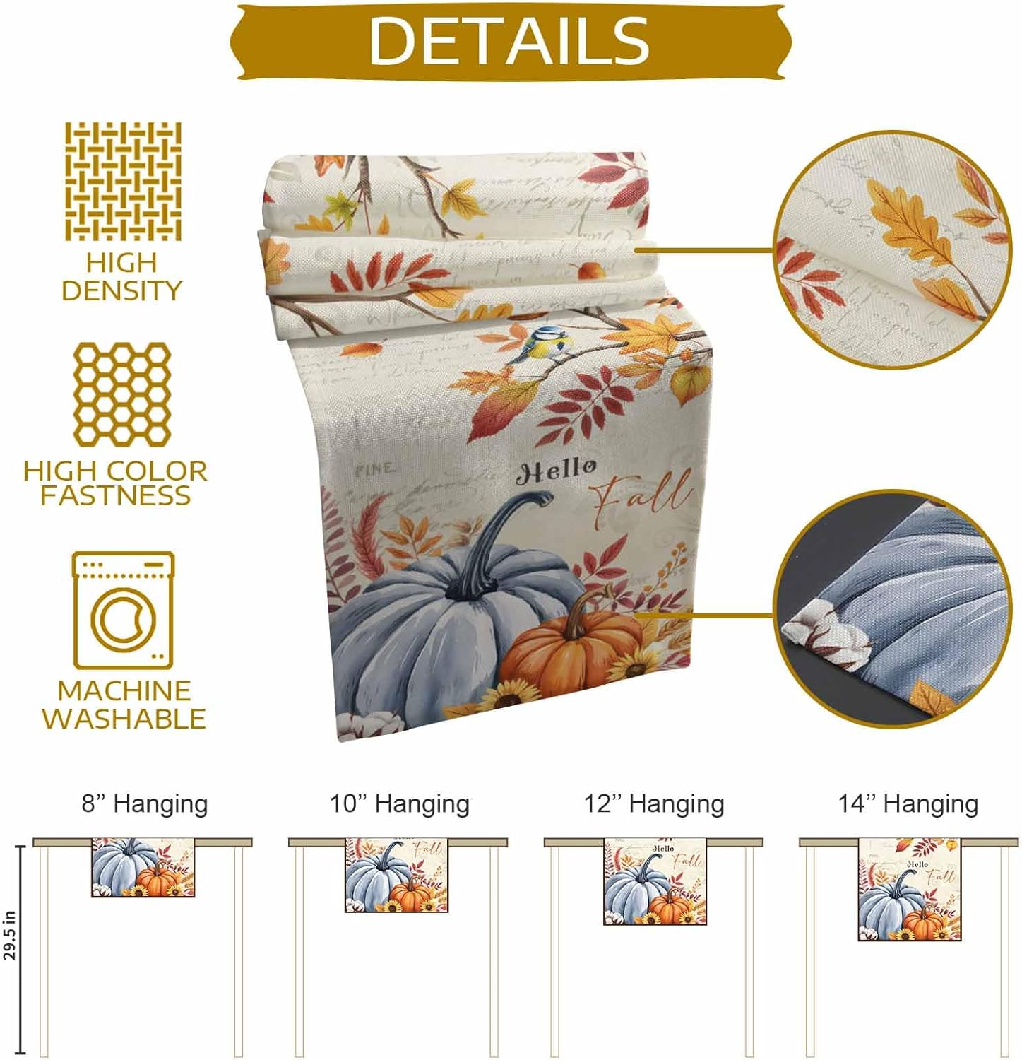 Thanksgiving Fall Cotton Linen Table Runner for Dining Kitchen, Blue Pumpkins Rustic Wedding Outdoor Party Autumn Tablerunners Decoration, Leaves Dresser Scarf Coffee Tablecloth Runners 13x90 Inches