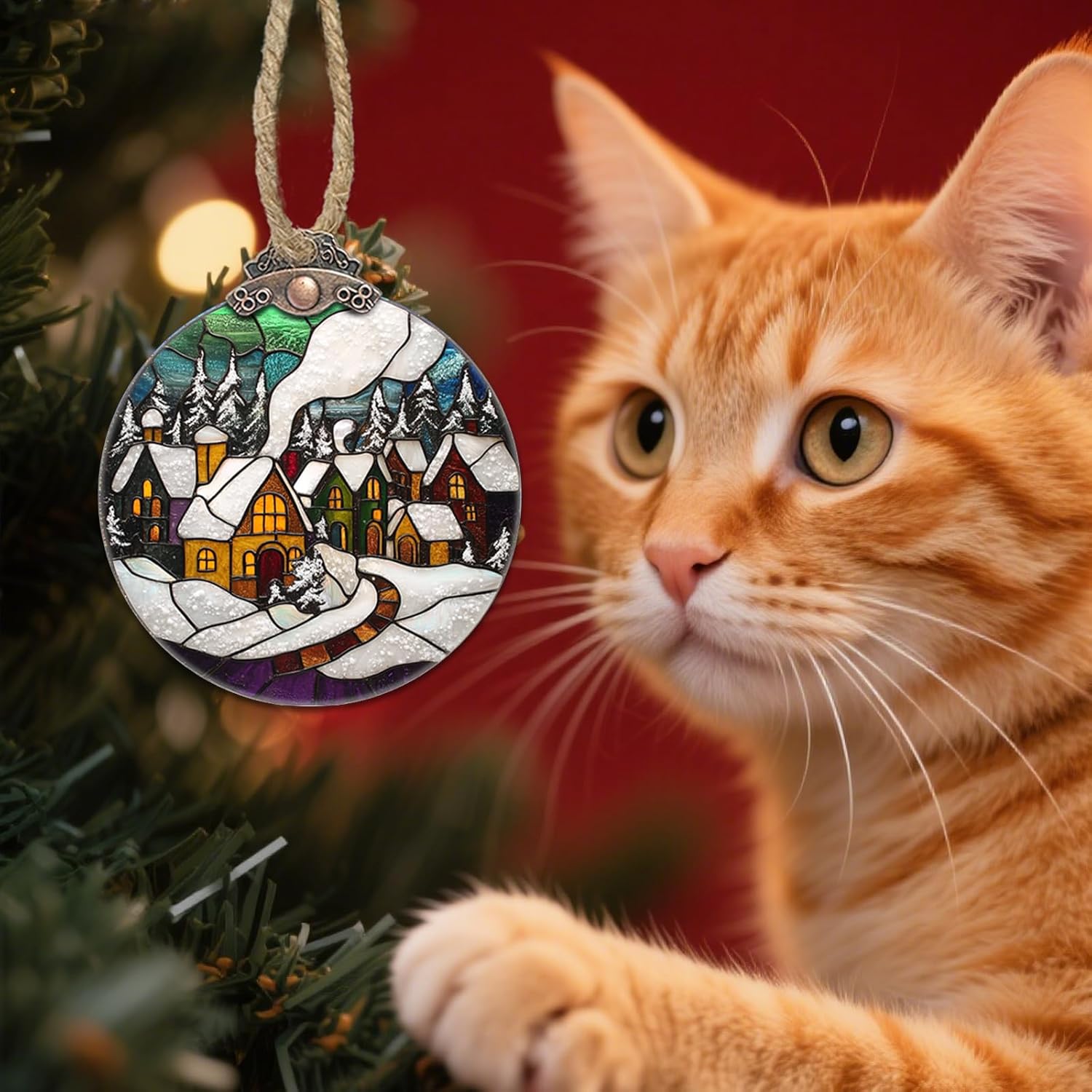 Stained Glass Christmas Decorations, Winter Snow Cabin Suncatcher for Window Christmas Tree Hanging Ornaments Retro White Sun Catcher Xmas Decor Gifts for Women Men Mom Nana Friend