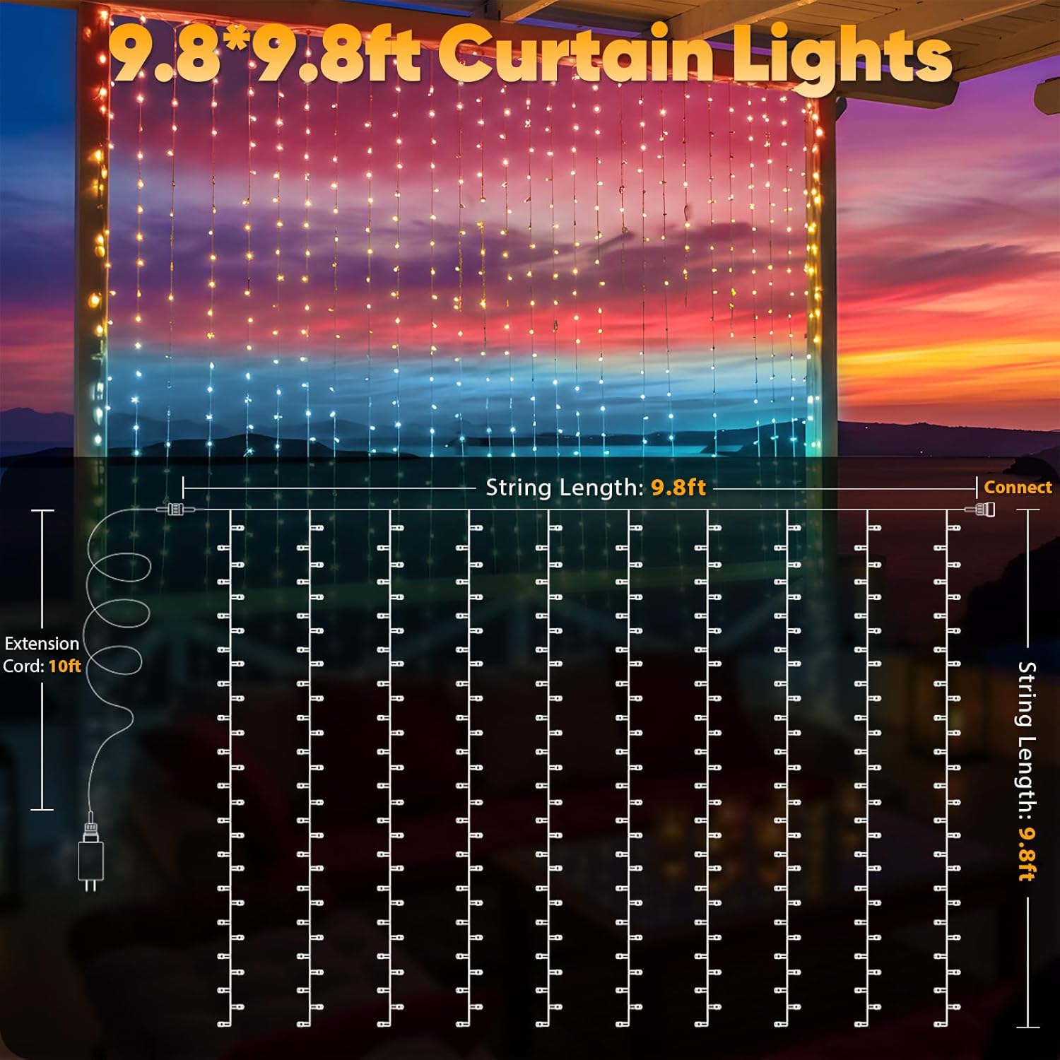 - ăCreating a Romantic AtmosphereăThe color scheme of the 300 LED Sunset Curtain Lights is inspired by the hues of the horizon and the ocean during sunrise or sunset. These lights vividly recreate the enchanting coastal sunset ambiance, seamlessly infusing tranquility and romance into any space, and crafting your exclusive cozy moments.