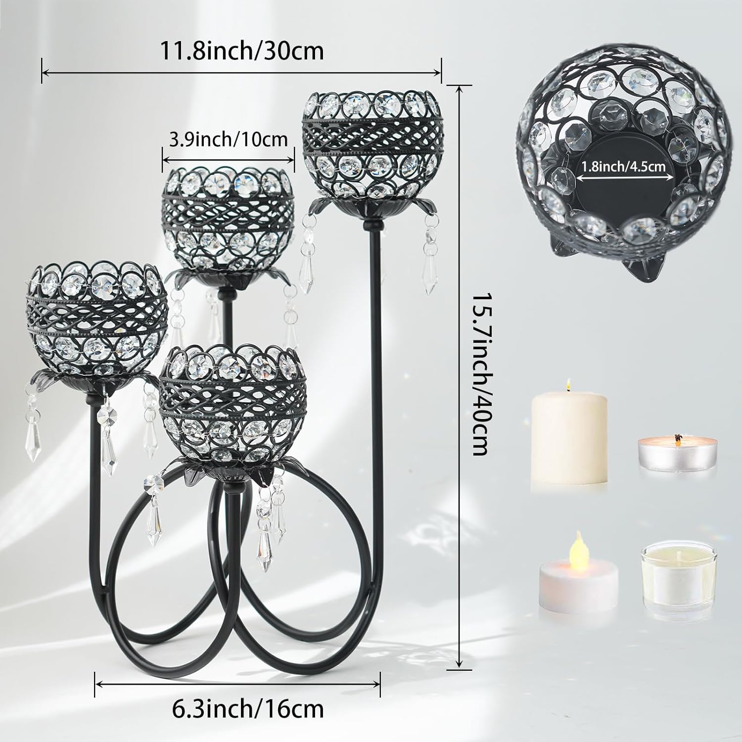 - Dazzling Crystal Bowls & Pendants:Each arm holds a 3.9-inch (10cm) wide crystal bowl with a 1.8-inch (4.5cm) inner tray, designed to securely fit standard tealights while shimmering glass pendants refract light into radiant patterns across your room.