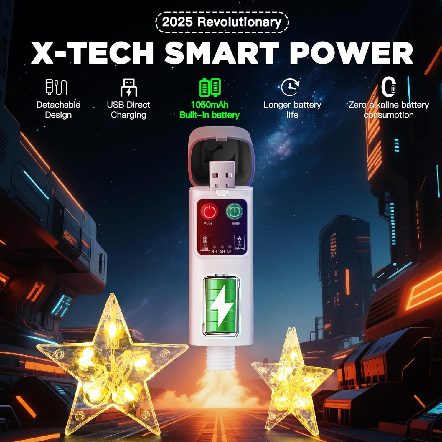 - 【Rechargeable & Detachable Power】Upgrade your Xmas decor with the innovative X-Tech Smart Power system! This built-in 1050mAh lithium battery supports direct USB charging and is fully detachable—making it more eco-friendly and efficient than traditional alkaline battery powered star window lights. Enjoy brighter Christmas star lights, longer runtime, and hassle-free recharging. This power solution delivers consistent luminosity while reducing waste. Say goodbye to dull lights and dead batteries!