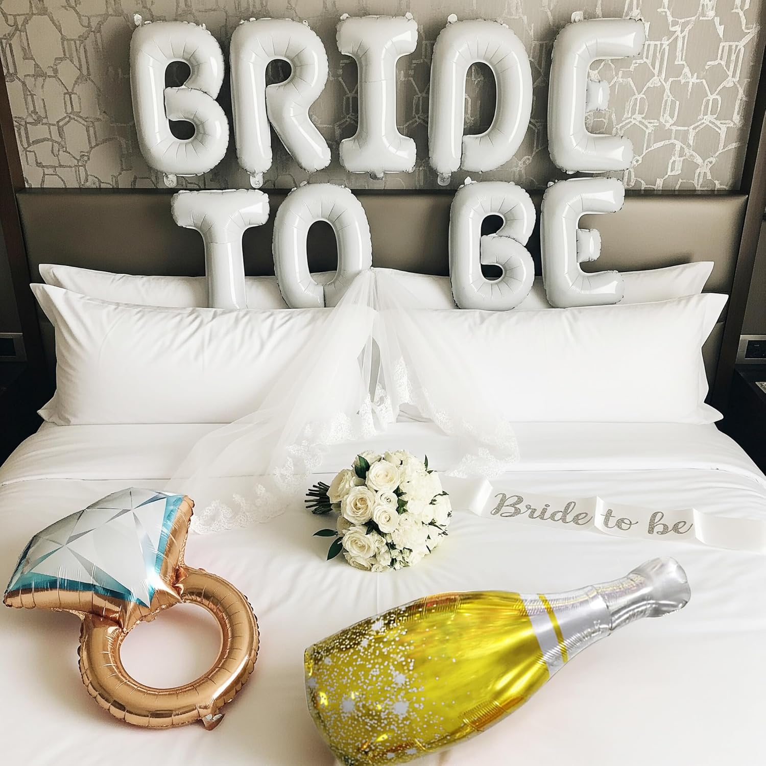 - Complete Bridal Glamour: All-in-One Celebration! This kit provides everything to create a fully coordinated and glamorous bridal theme. Beyond the elegant balloons, you get prominent white "BRIDE TO BE" foil letters, romantic white heart-shaped foil balloons, celebratory champagne bottle foil balloons, an impressive diamond ring foil balloon, a beautiful veil, and a chic sash. This ensures a cohesive and immersive setting for capturing those precious pre-wedding memories.