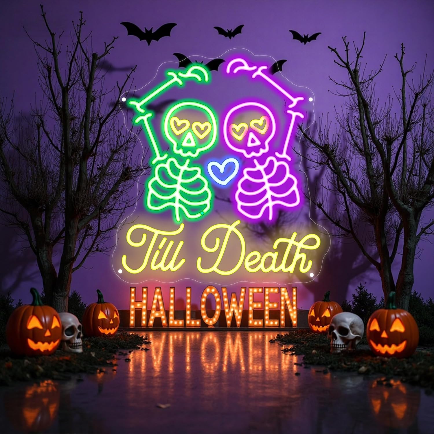 Skull Till Death Neon Sign, Halloween Wall Sign, Horror Decor Wall Skull Neon Sign for Wedding Engagement Party Bridal Shower Decor Til Death Do Us Party Valentines Day Gifts