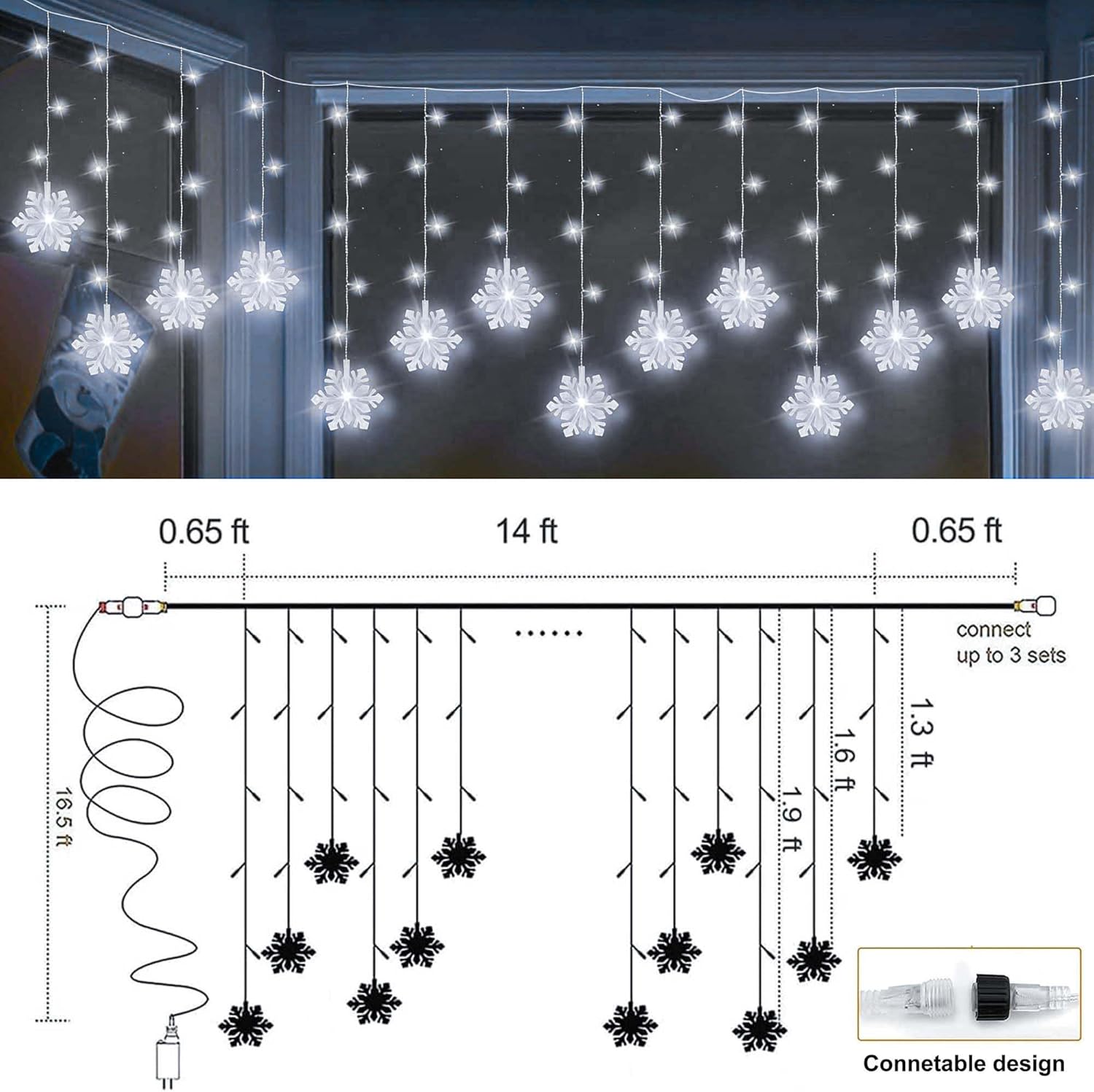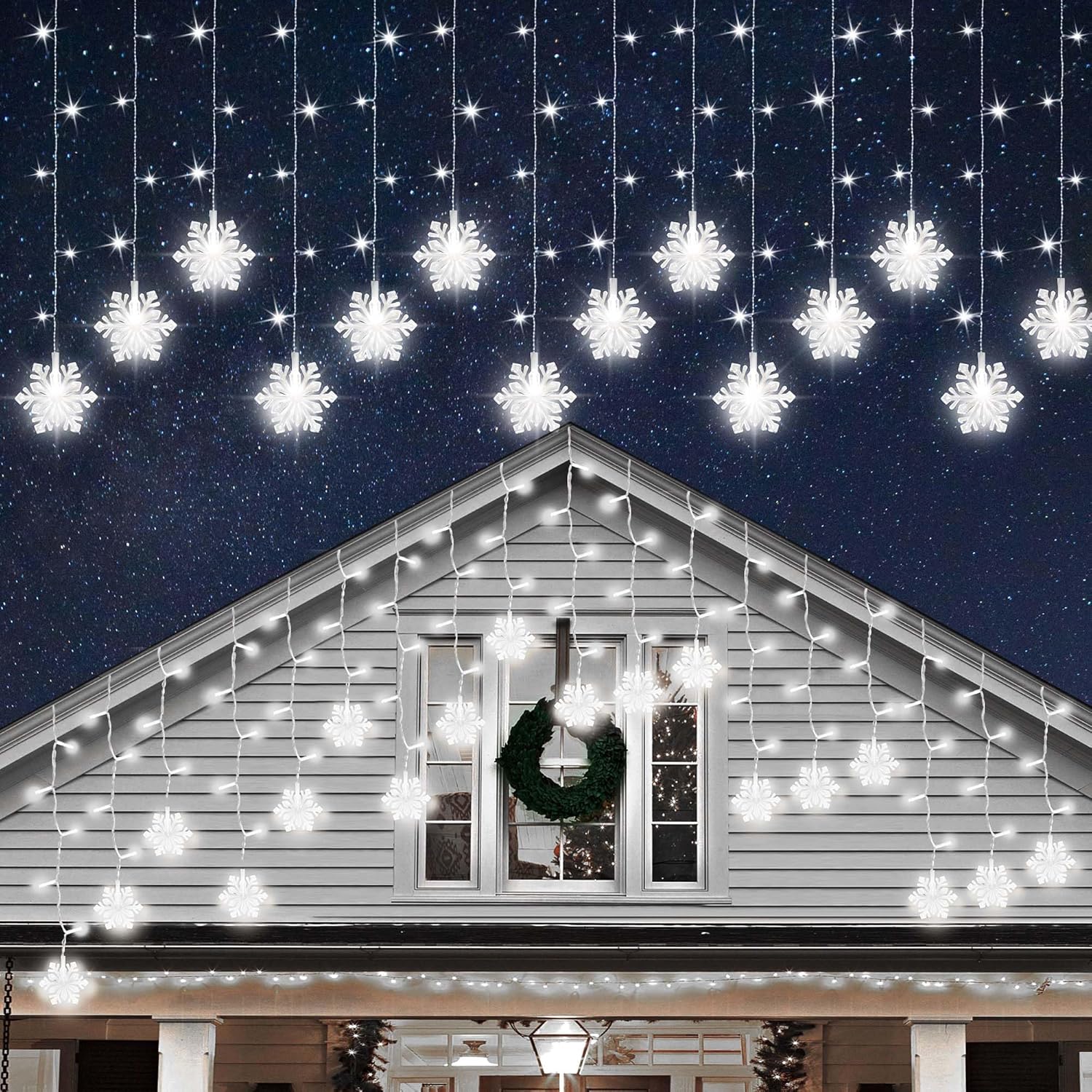 - Best Christmas Decoration: 150 LED white icicle lights emit soft light, and the end of each string is decorated with translucent snowflakes, suitable for eaves, store windows, weddings, Christmas party decorations.