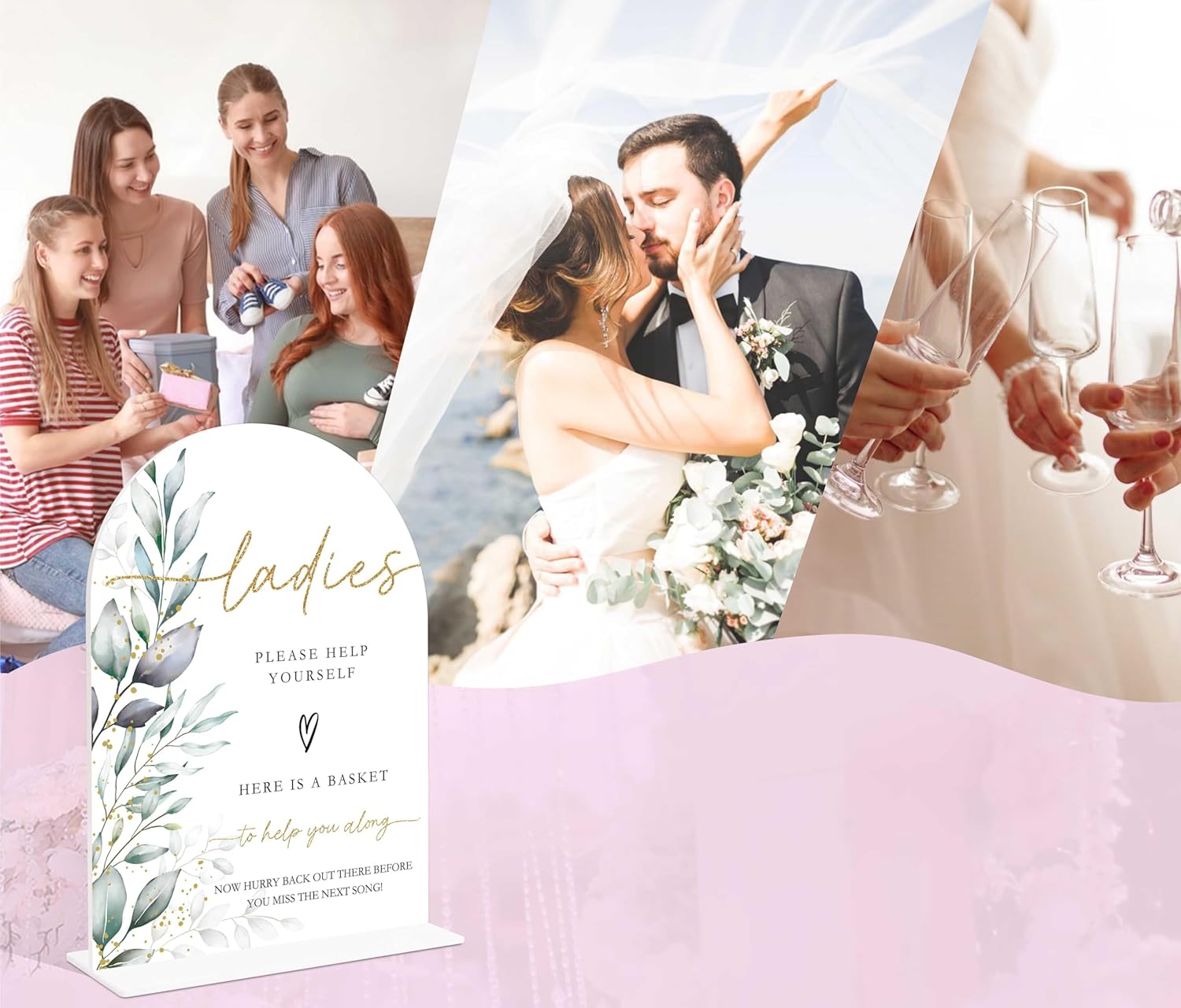 Acrylic Wedding Signs, Greenery Theme Ladies Please Help Yourself Sign, Bridal Shower Table Decor with Stand, Wedding Bathroom Basket Supplies for Engagement, Anniversary, Newlywed Event and Party, 07