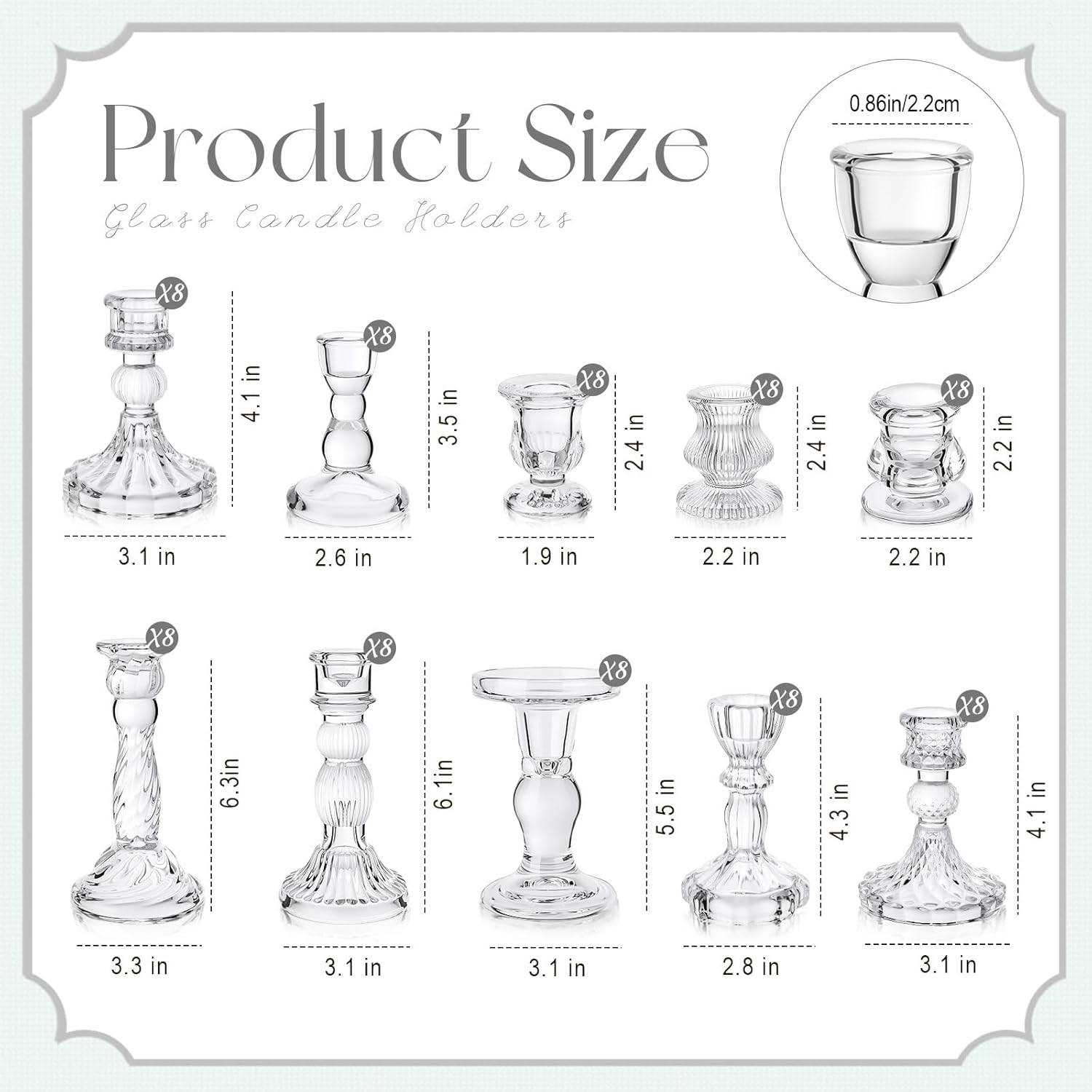 - Package Contents: you will receive 80 pieces 10 style glass candle holders in different sizes, which have different heights, smooth shapes and smooth finishes; The candlestick holder adds a clean, and elegant aesthetic to any space, it is suitable for a variety of candles
