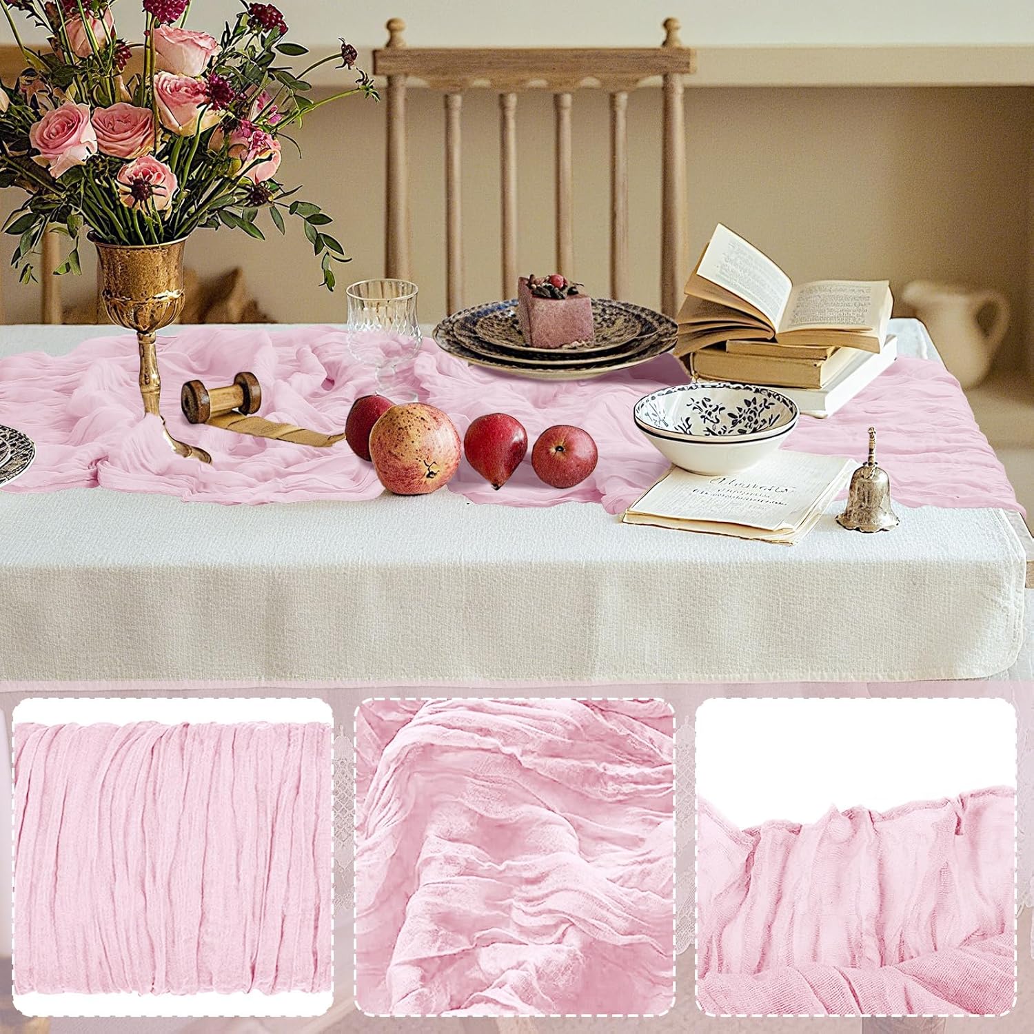 - 【Washing Tips】:These vintage wedding table runners are recommended for hand wash in cold water with mild detergent, or machine wash in the gentle cycle with a laundry bag; In order to maintain wrinkled texture, please do not iron or use hot water, lay flat or hang dry, do not bleach or soak for too long time, which are better for keeping these cheesecloth table runners for a long time use.