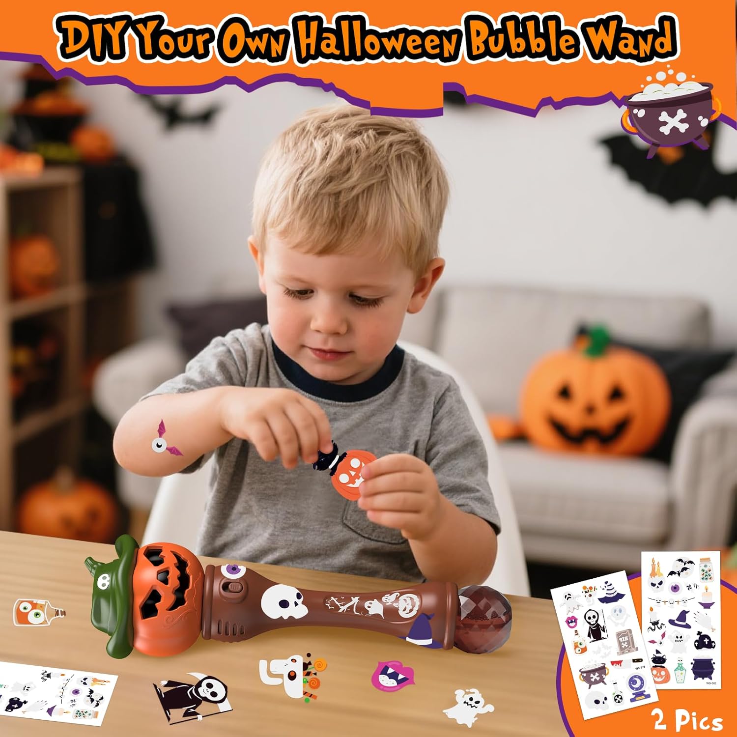 - EYE-CATCHING LOOK, DIY STICKERS: Our kids' bubble wand features a unique pumpkin-themed design, with a glowing blue light at the top that creates a captivating visual effect. The classic Halloween stickers spark children's creativity, making it perfect for Halloween parties, trick-or-treating, and creating a spooky atmosphere
