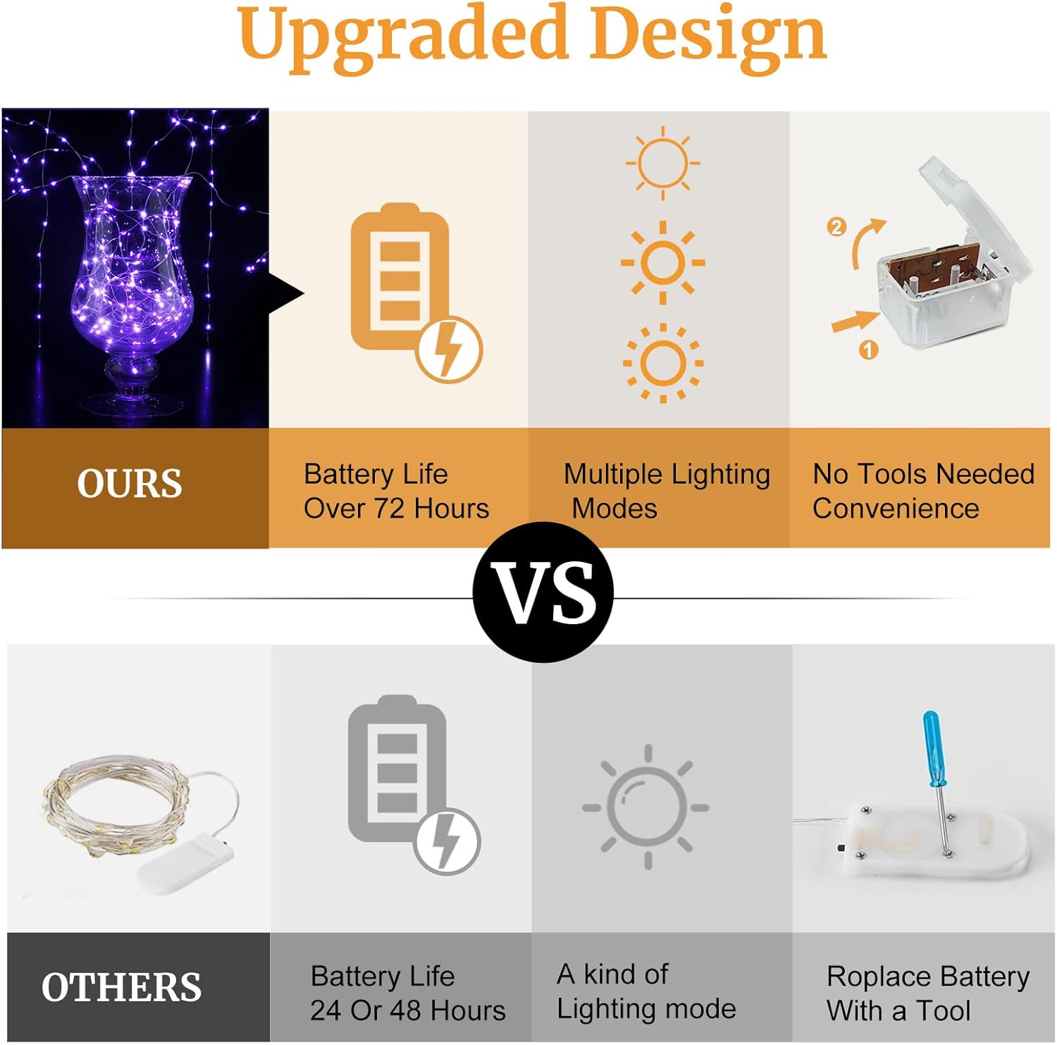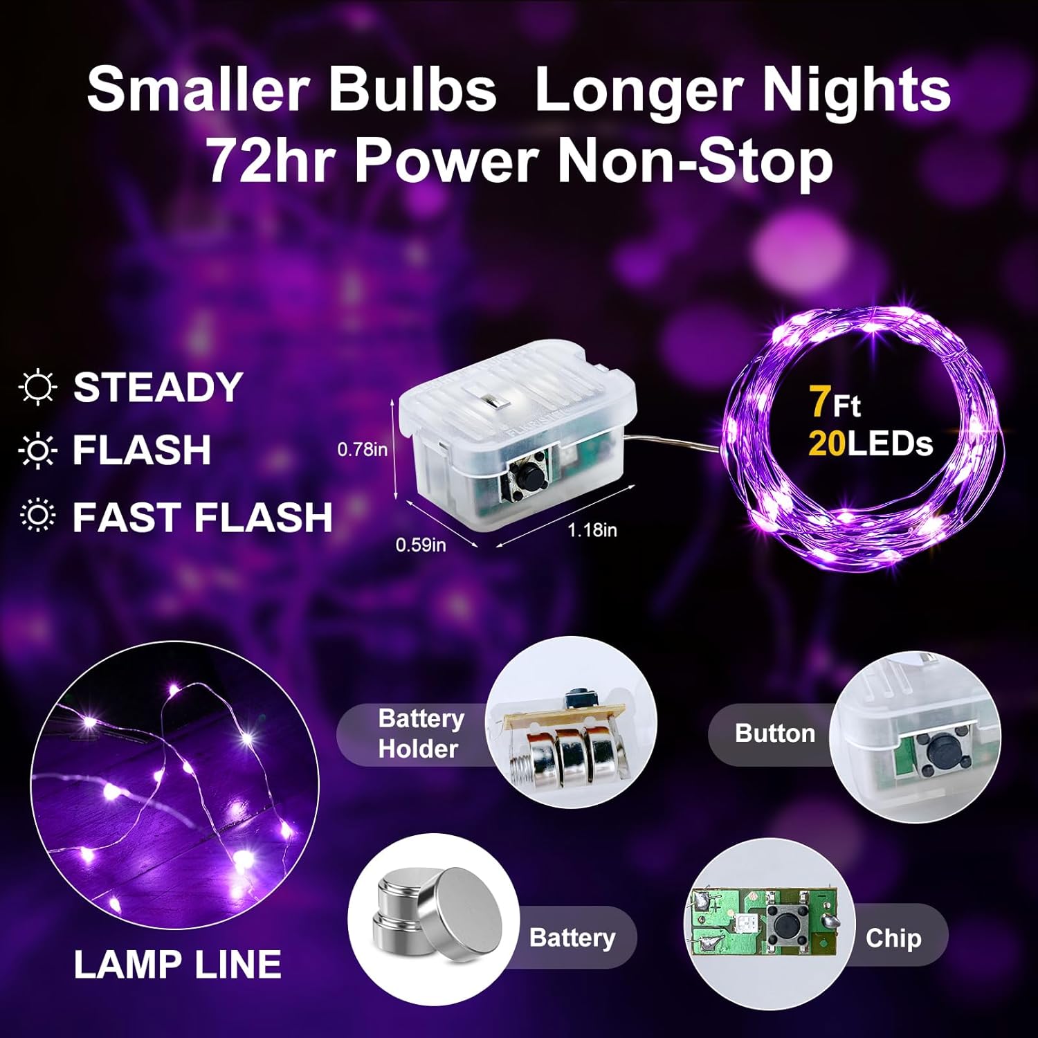 Aogist 50 Pack Fairy Lights 3 Modes 7ft 20 LED Waterproof,Battery Operated Silver Wire Firefly Starry Moon Mini String Lights for Mason Jars Christmas DIY Crafts Wedding Party Bedroom,Purple
