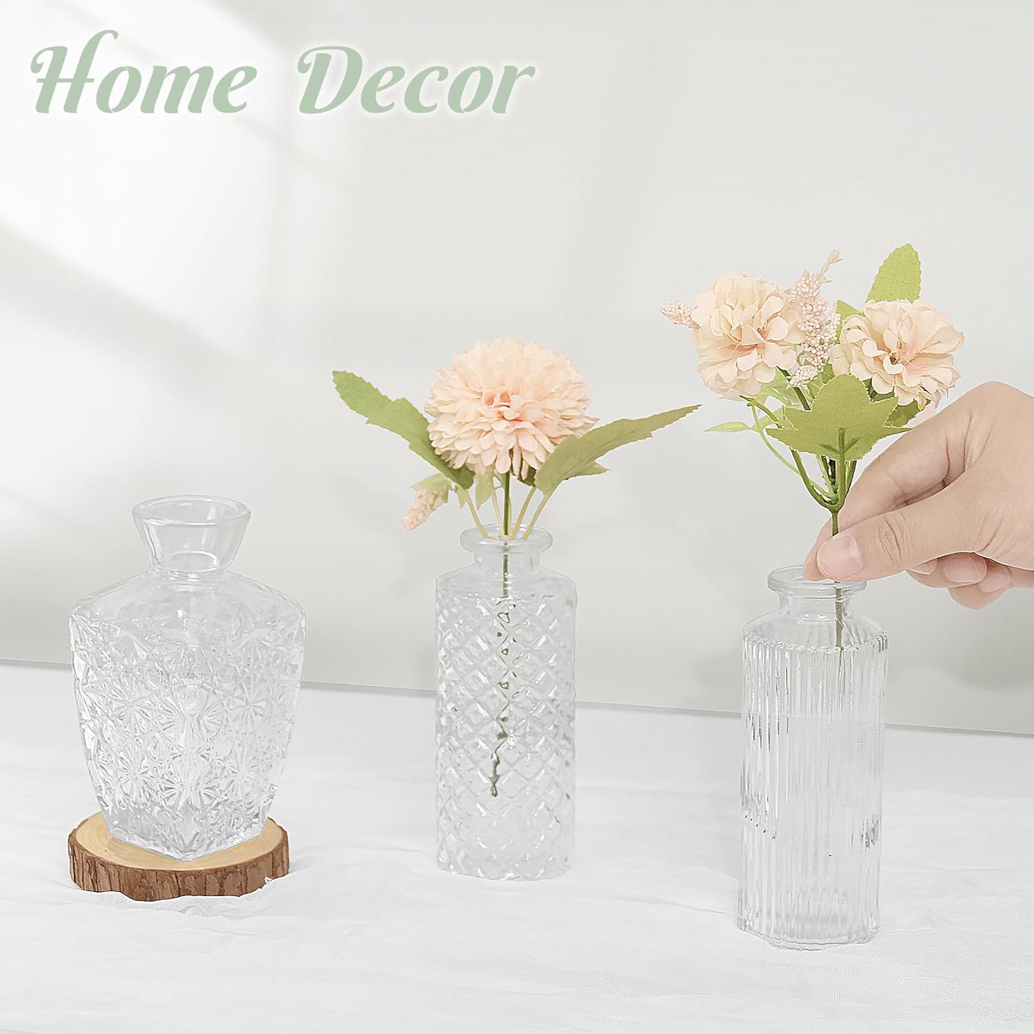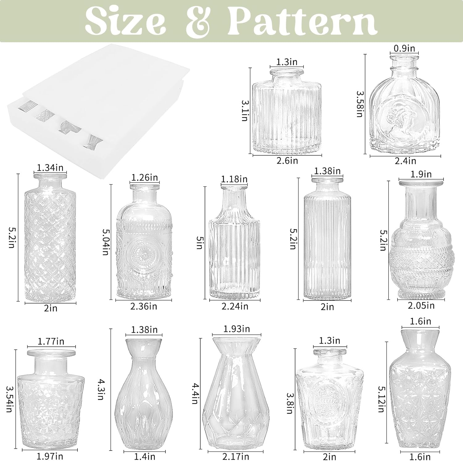 - Vintage Rustic Design: this 12pcs mini glass bud vases set with the unique design style,and each small vase is crafted different exquisite pattern,which are both simple and fashionable.The different designs,heights, and shapes make this collection interesting when you use it in the different event or home decor