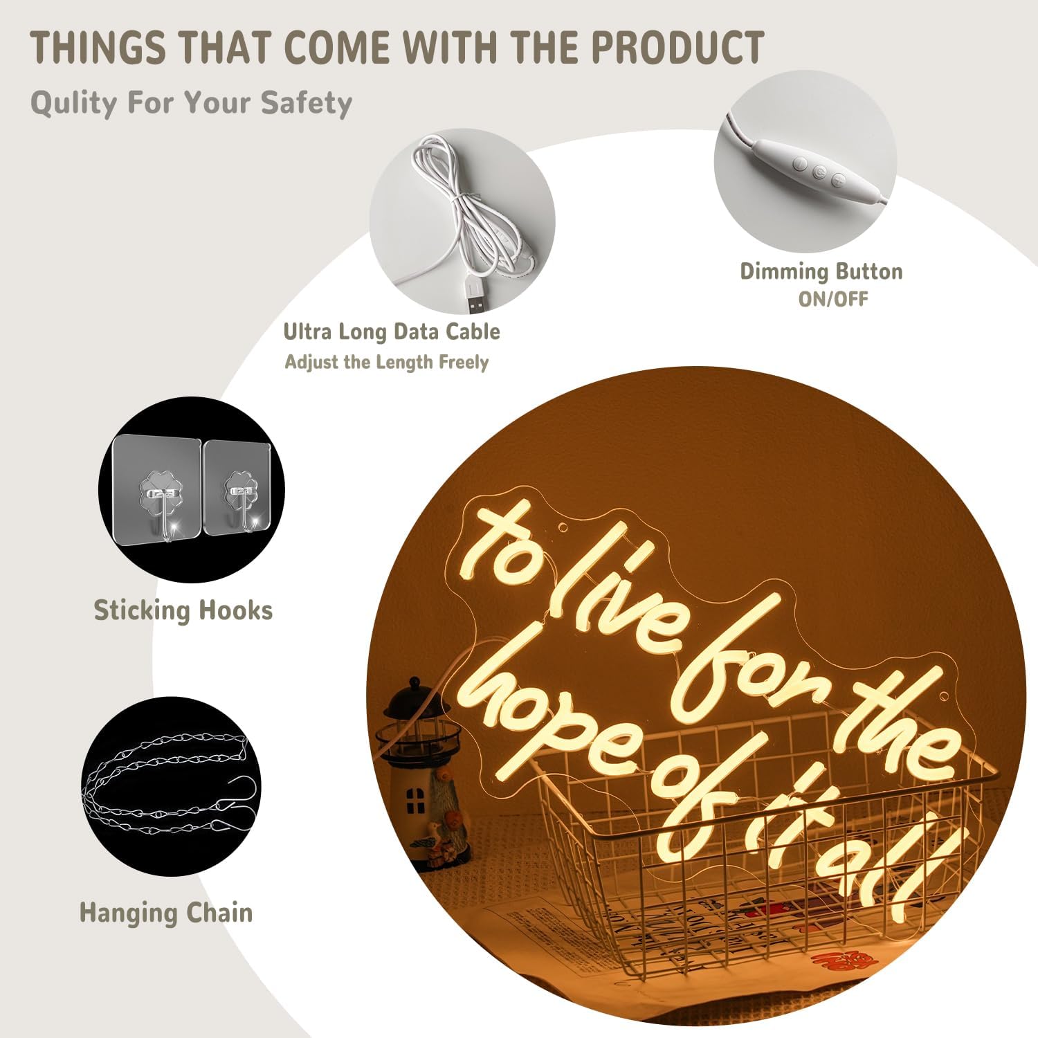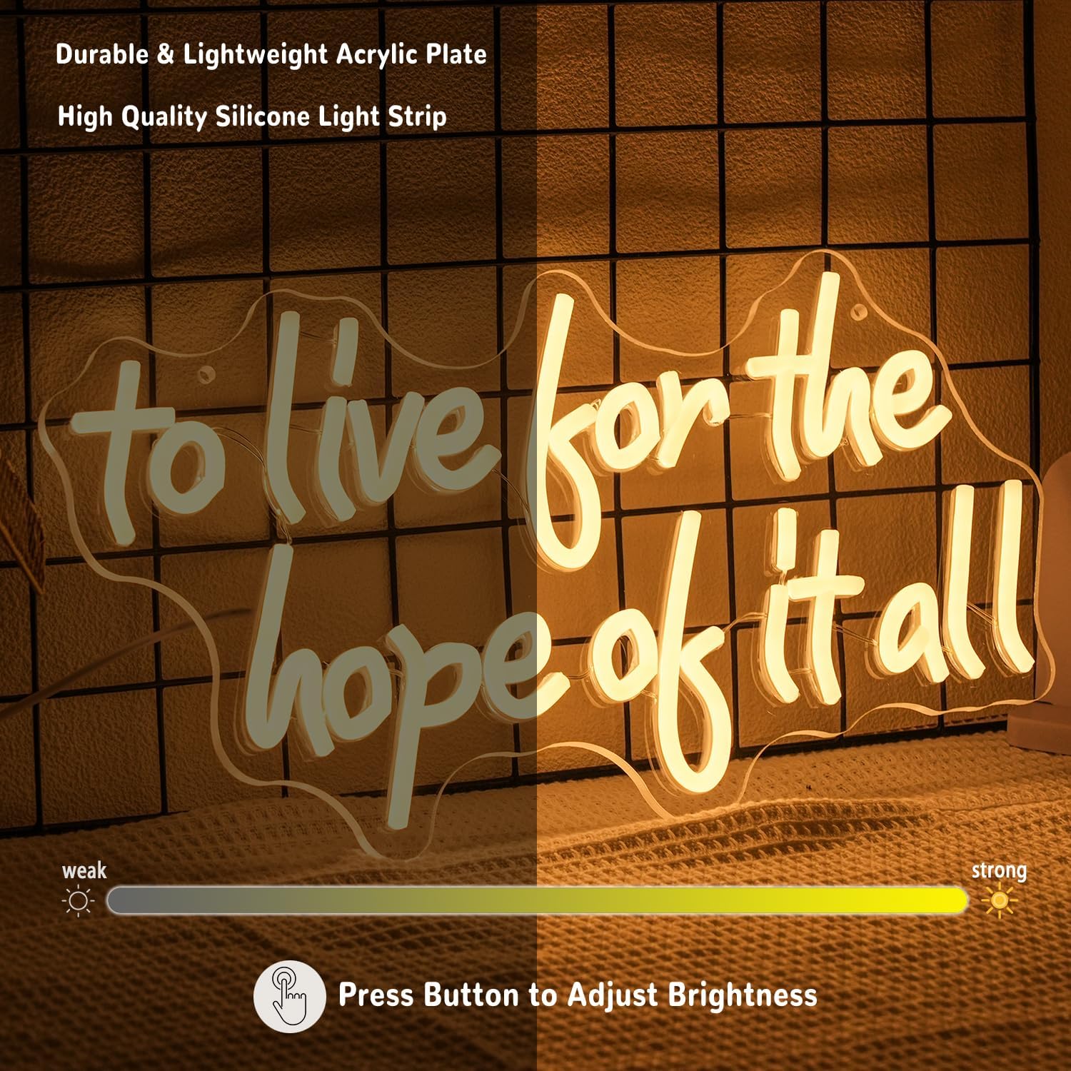 - High Quality Material: The material of to live for the hope of it all led neon light is soft LED strip and acrylic backing. Then professional craftsmen combine these materials to make letters neon lights. Words neon light made in this way are safe, energy saving, durable and bright.