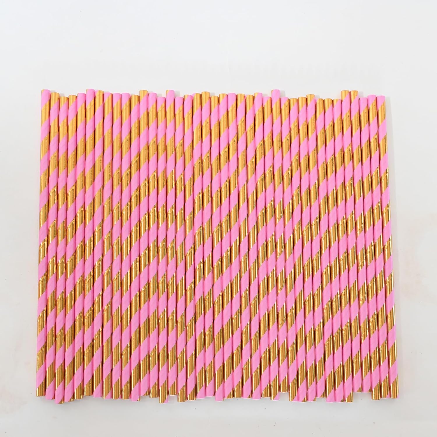 Paper Straws for drinking - Pink Gold Striped Biodegradable Disposable Paper Straws, 7.75 Inch, 100 Pieces