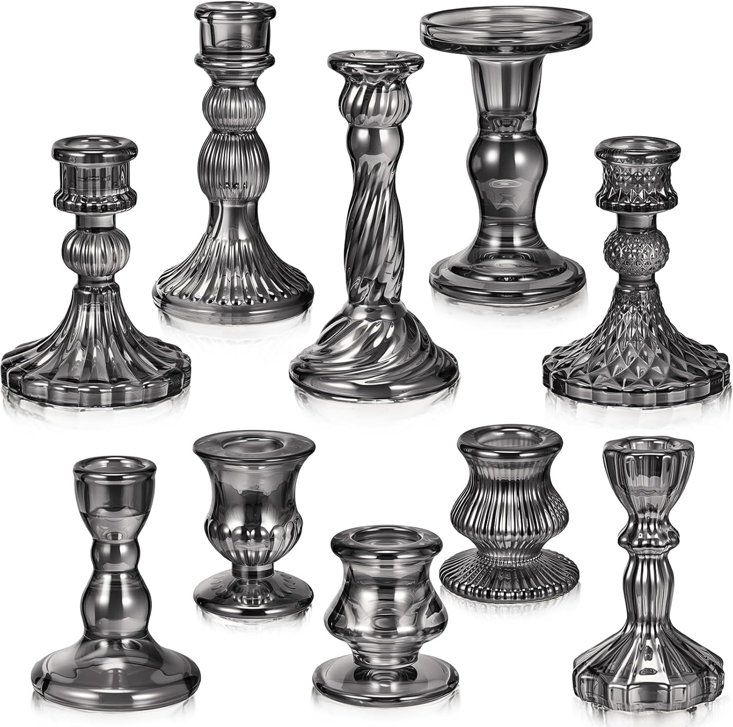 - Package Contents: you will receive 10 pieces 10 style black glass candle holders in different sizes, which have different heights, smooth shapes and smooth finishes; The candlestick holder add a clean, and elegant aesthetic to any space, it is suitable for a variety of candles