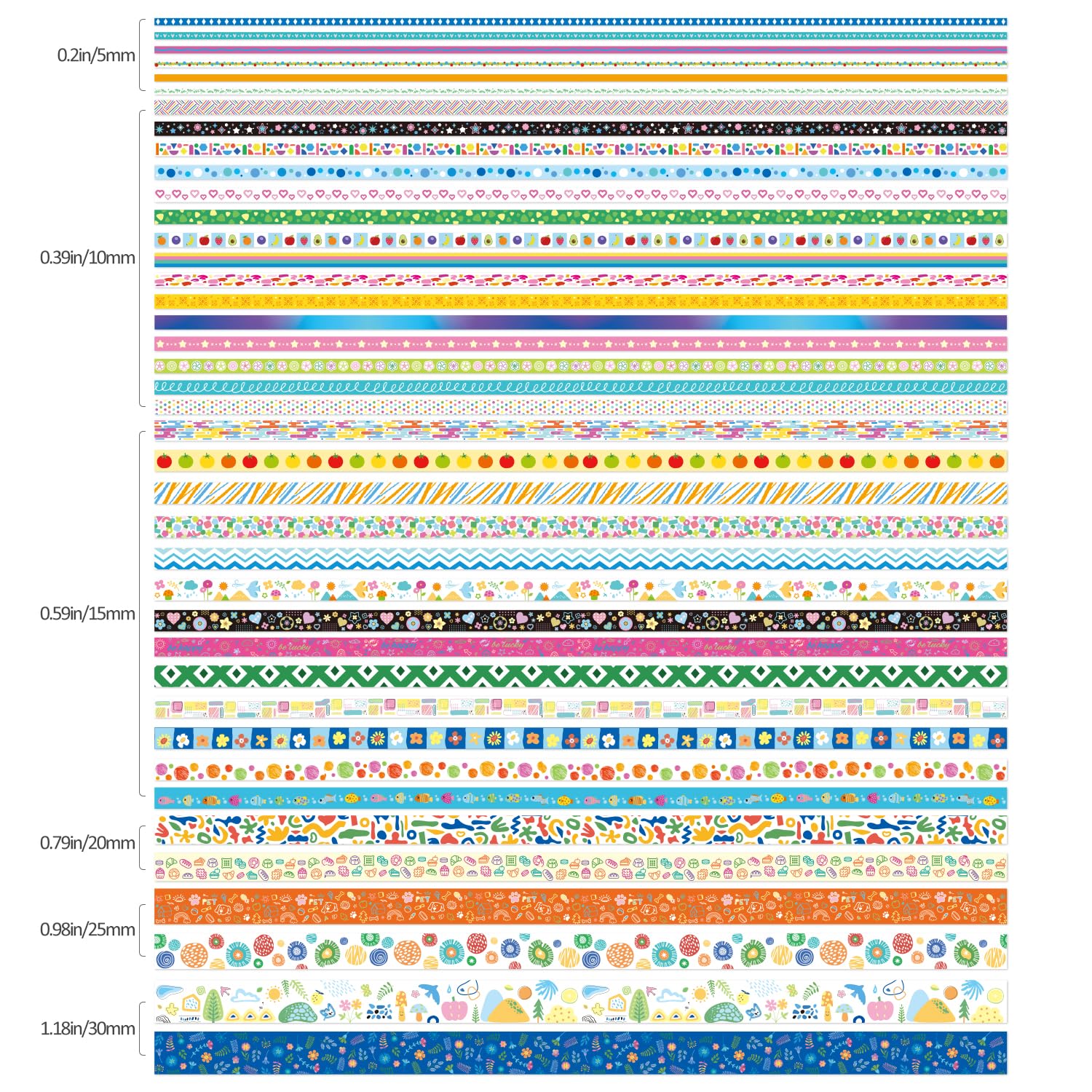 - ✨40 Rolls Palette Days Washi Tape, 1.18 inch (30mm) wide x 2 tapes; 0.98 inch (25mm) wide x 2 tapes; 0.79 inch (20mm) wide x 2 tapes; 0.59 inch (15mm) wide x 13 tapes; 0.39 inch (10mm) wide x 15 tapes; 0.19 inch (5mm) wide x 6 tapes. These different series and sufficient quantity washi paper tapes can meet your use and replacement needs.