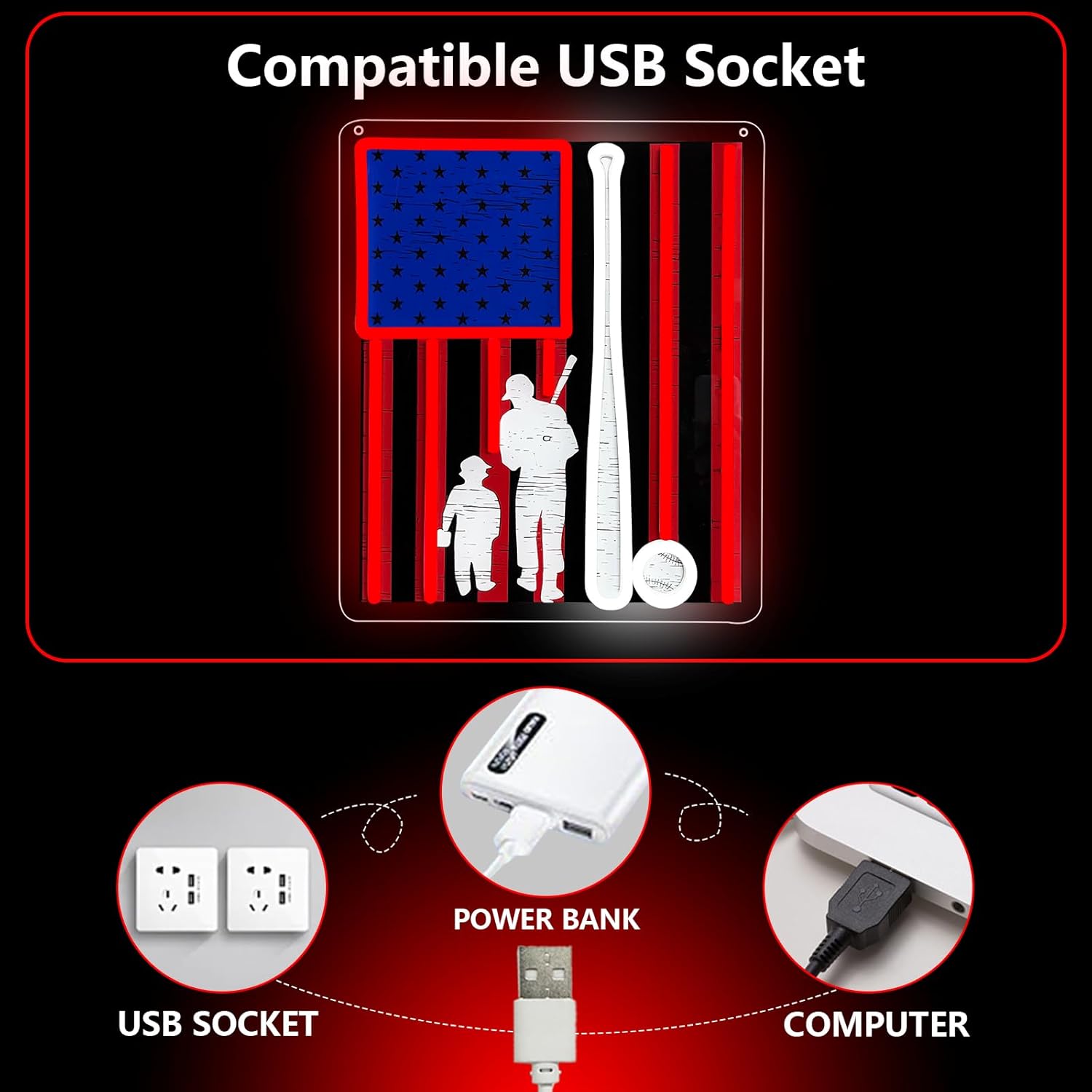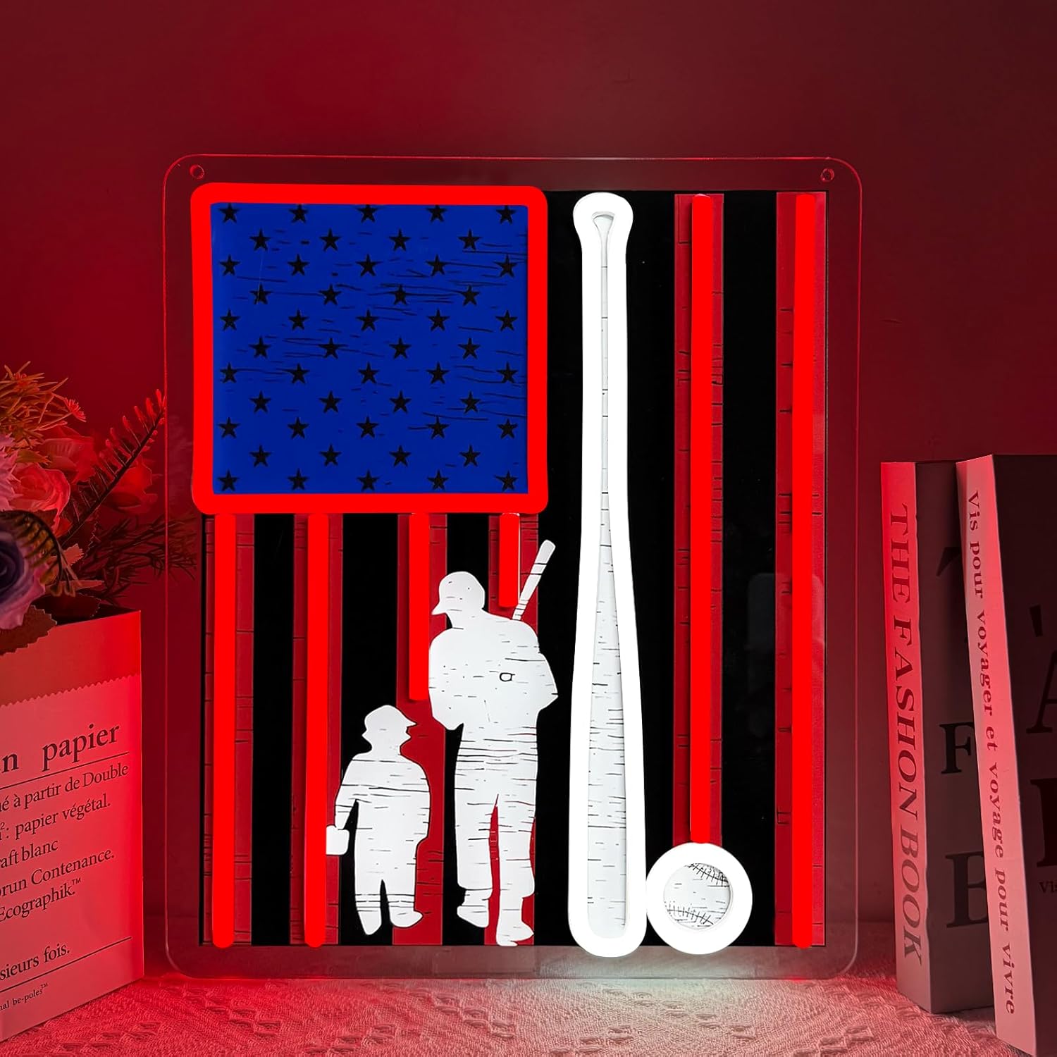 - Baseball & Family Theme – Creative neon sign with a red, blue, and white striped background, paired with a bat, ball, and father-child silhouette. A stylish way to combine baseball passion with warm family moments.