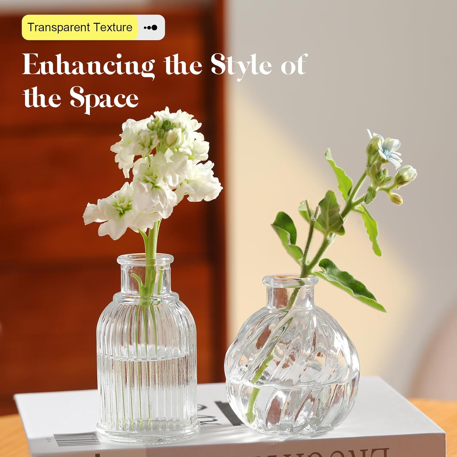 - Uses:miniature clear vase is made of high-quality thick borosilicate glass. Various kind of size and shape,smooth lines, exquisite embossed patterns of each vases. Our flower vases for centerpieces are versatile enough for various uses.Display fresh or dried flowers,reeds,or essential oils in these mini flower vases,which are ideal for centerpieces on dining tables, shelves,or window sills.