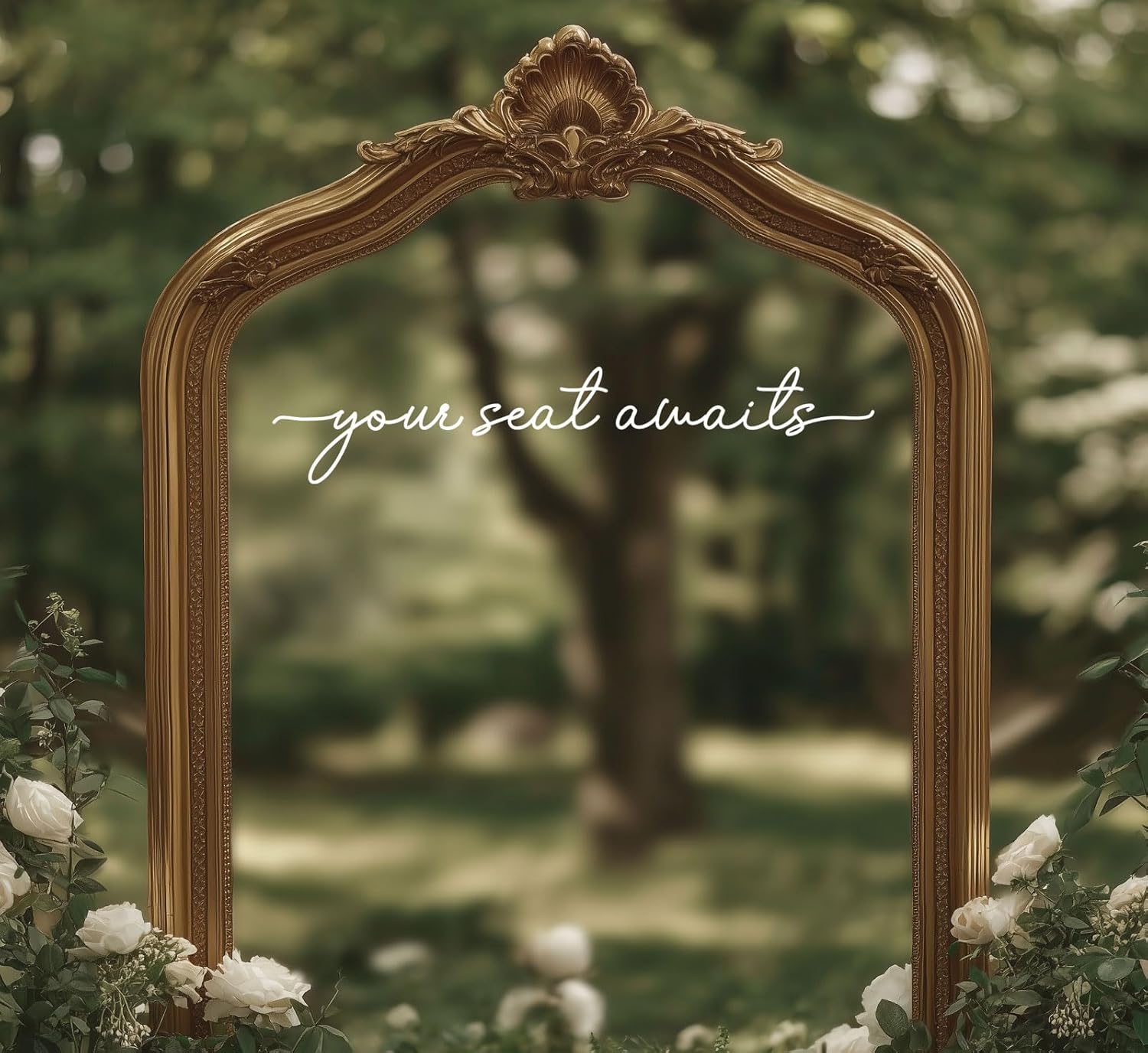 Your Seat Awaits Vinyl Decal, Wedding Seating Sticker, Mirror Decal for Seating, Please Find Your Seat Signs, Wedding Decor Sign (White, Width 17")