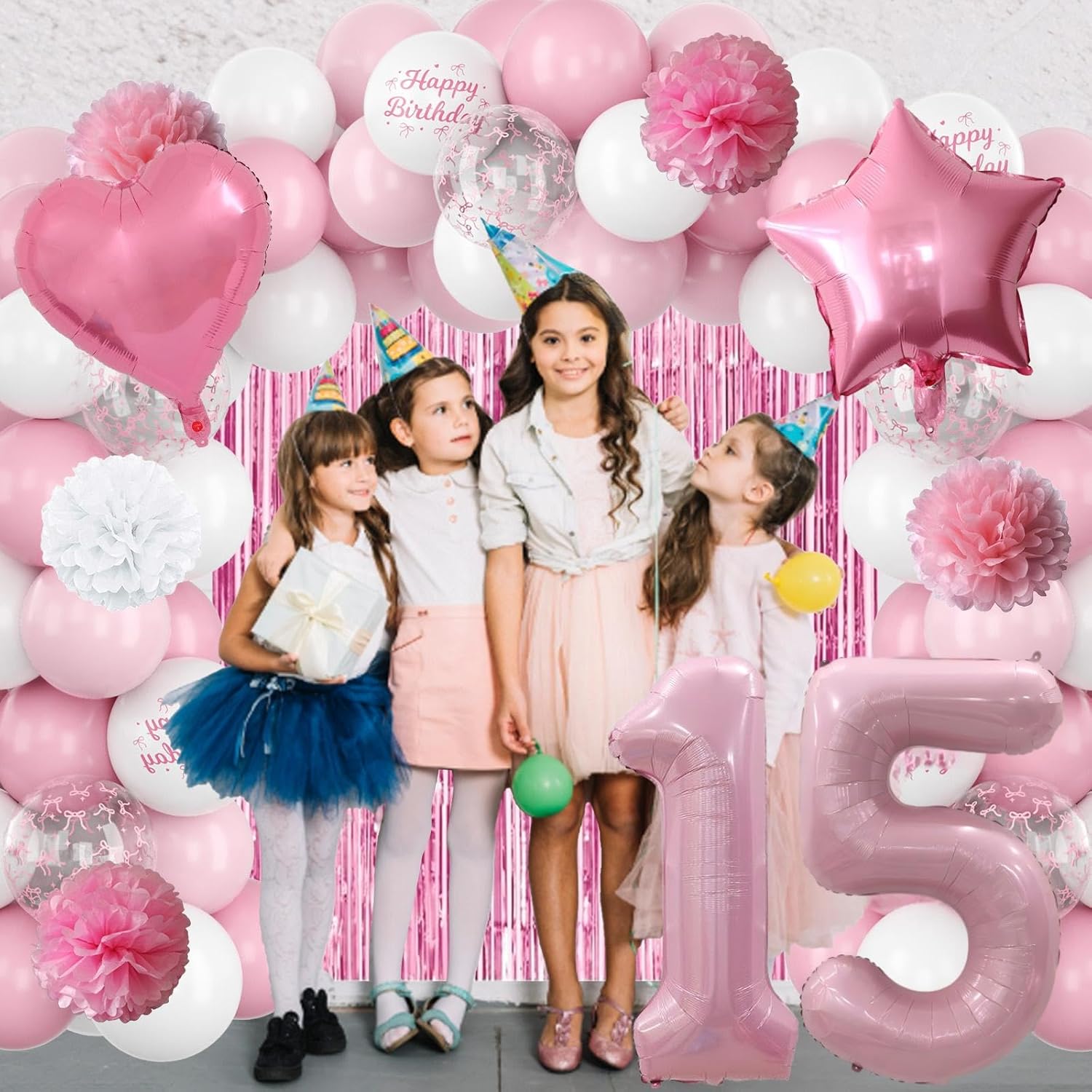 - PACKAGE INCLUDES: 1pc pearl pink number 15 balloon, 1pc bow happy birthday banner, 2pcs pink paper pom poms, 2pcs light pink paper pom poms, 2pcs white paper pom poms, 1pc pink curtain, 1pc light pink star foil balloons, 1pc light pink heart foil balloons,6pcs light pink balloons, 6pcs pastel pink balloons, 4pcs white balloons, 2pcs birthday printed balloons, 2pcs bow clear balloons, 1pc ribbon