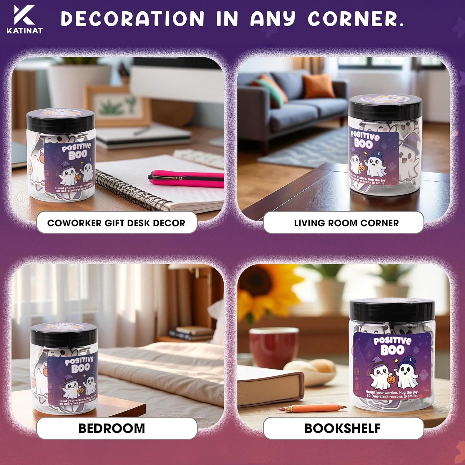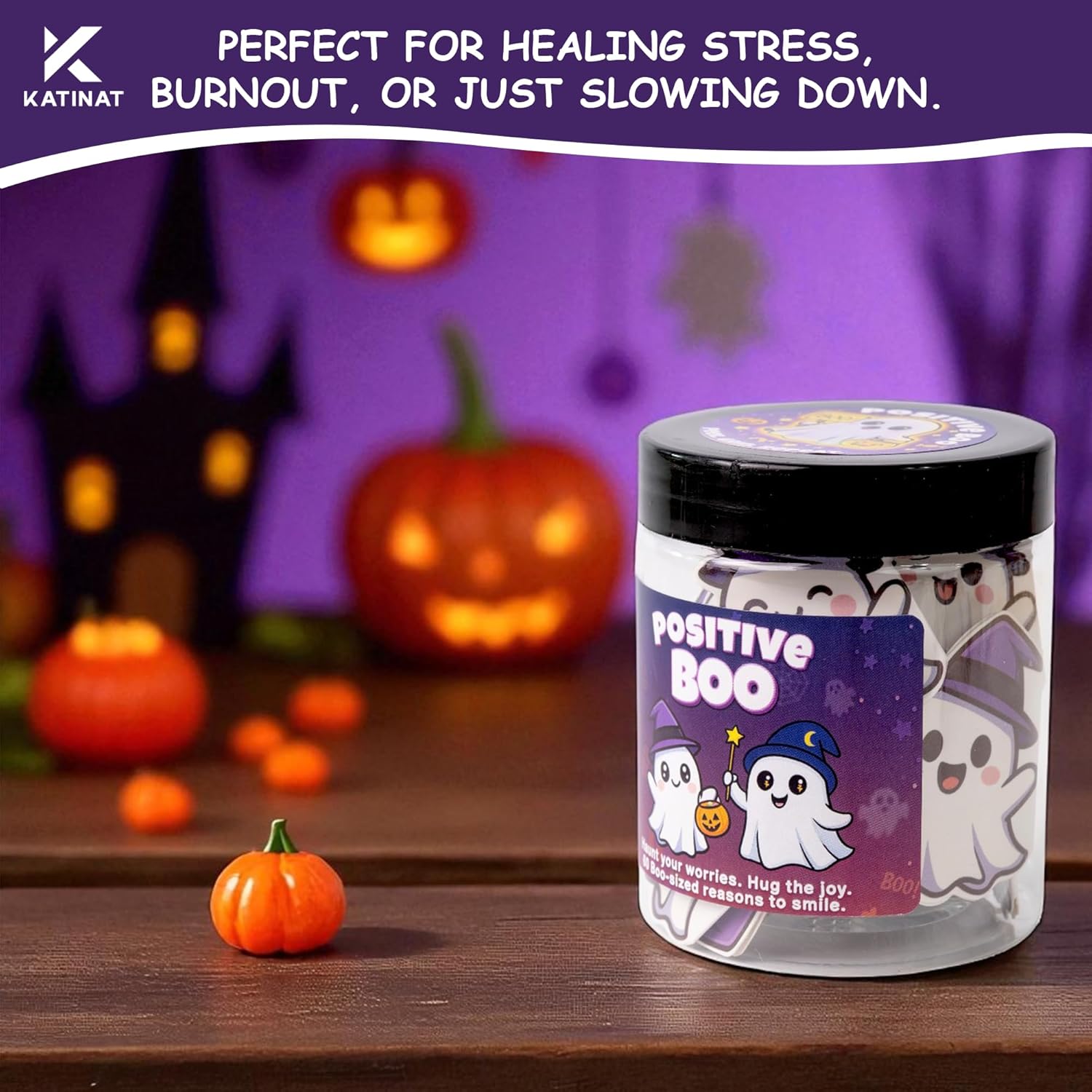 - π» Positive Boo Jar β Emotional Support Ghost: A creative Halloween Jar with 60 ghost-shaped affirmation cards, perfect for boo basket stuffers and halloween boo basket stuffers.