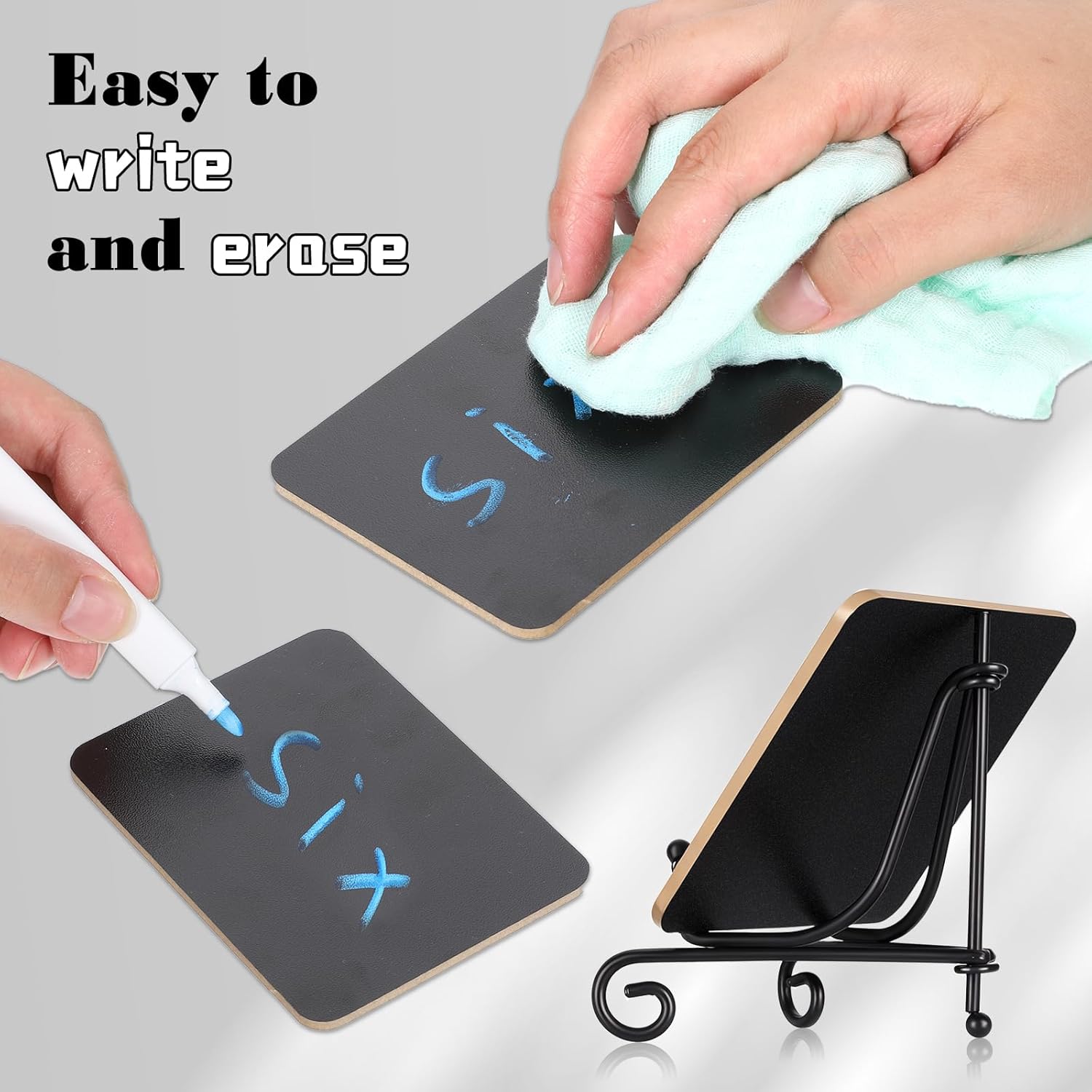 - Effortless maintenance: reusable tabletop chalkboard smooth plastic surface wipes clean with included cloth - no ghosting or staining. stands detach for compact storage between uses. withstands humidity without warping.