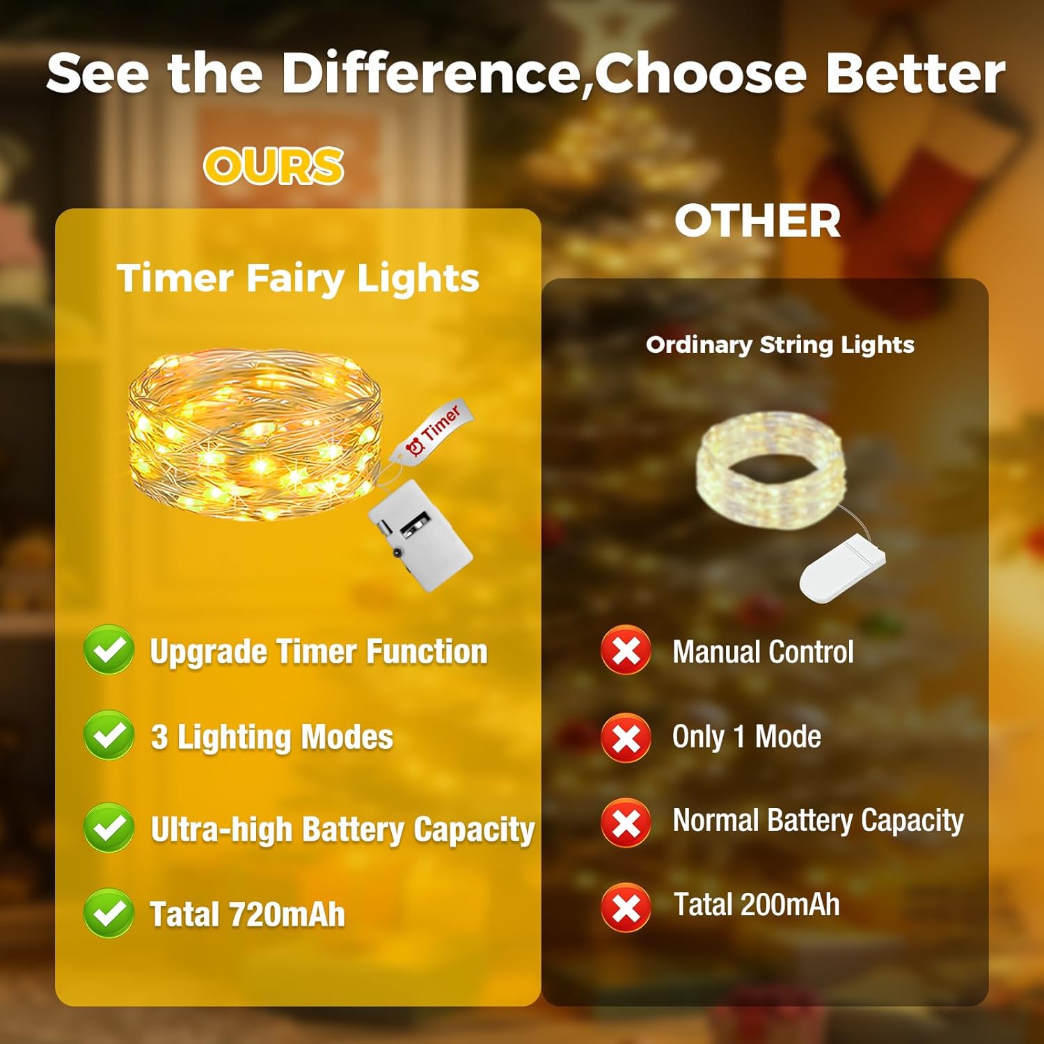 - 【Auto Timer】The newly upgraded fairy lights battery operated features an intelligent timer function (6h ON / 18h OFF). After the switch is turned on for the first time, it will run on a daily cycle.Fall asleep worry-free-lights turn off automatically to save power. Wake up to bright lighting with zero manual reset, providing you with superior convenience and energy efficiency.