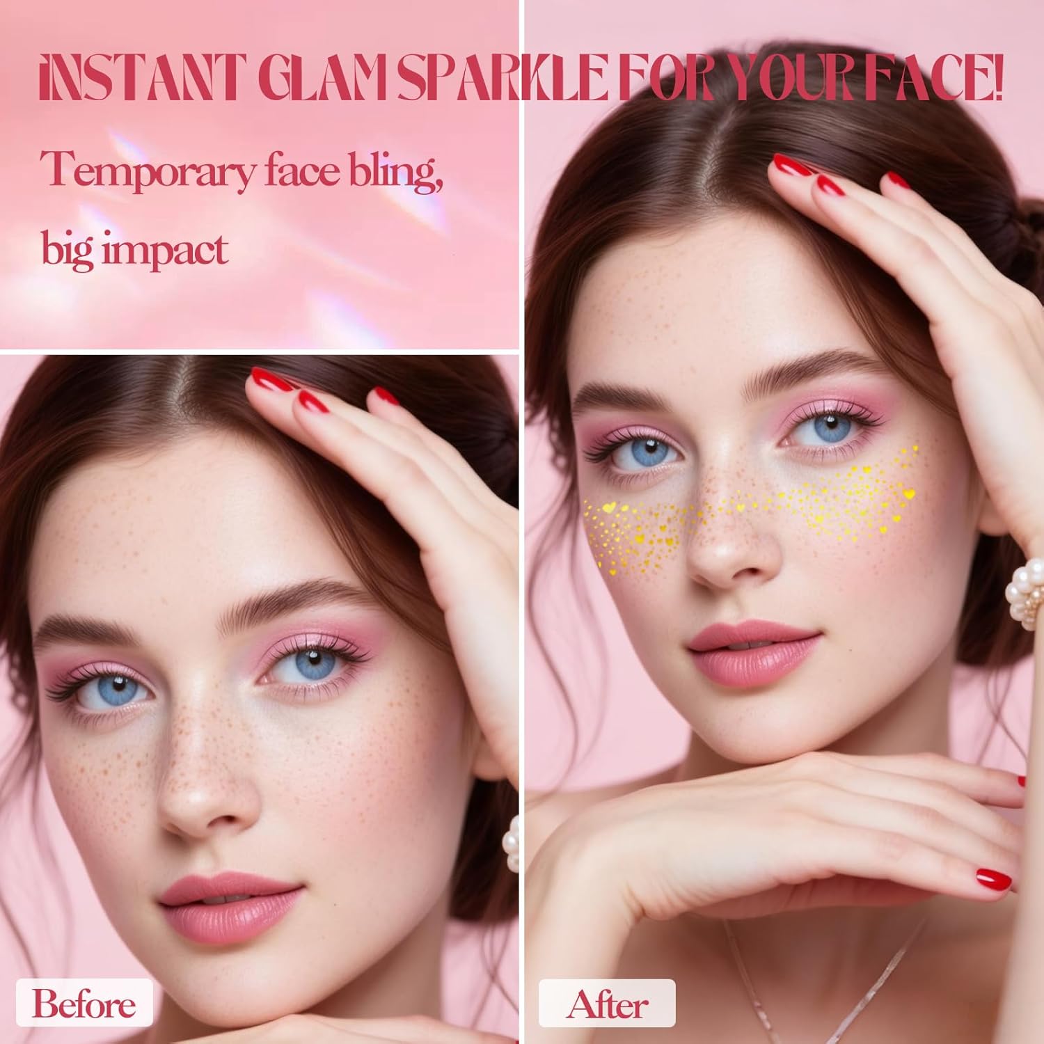 - [Premium Glitter Freckles Face Tattoo with Sparkle Effect] Our 15 PCS gold glitter freckles-featuring fun shapes like hearts and stars, are crafted with high-quality, skin-friendly materials for a radiant and comfortable wear. These delicate face glitter for women provide a glamorous sparkle with gentle adherence, suitable for most skin types.