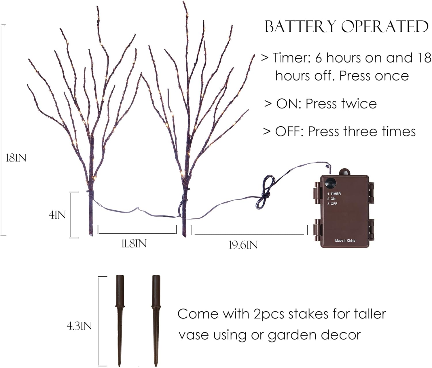 - 【Lighted Branches with Timer】: Operated on a timer, 6 hours on/18 hours off. Required 3 AA batteries (Batteries NOT included)