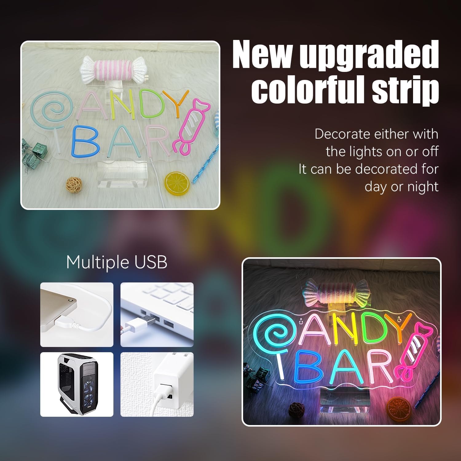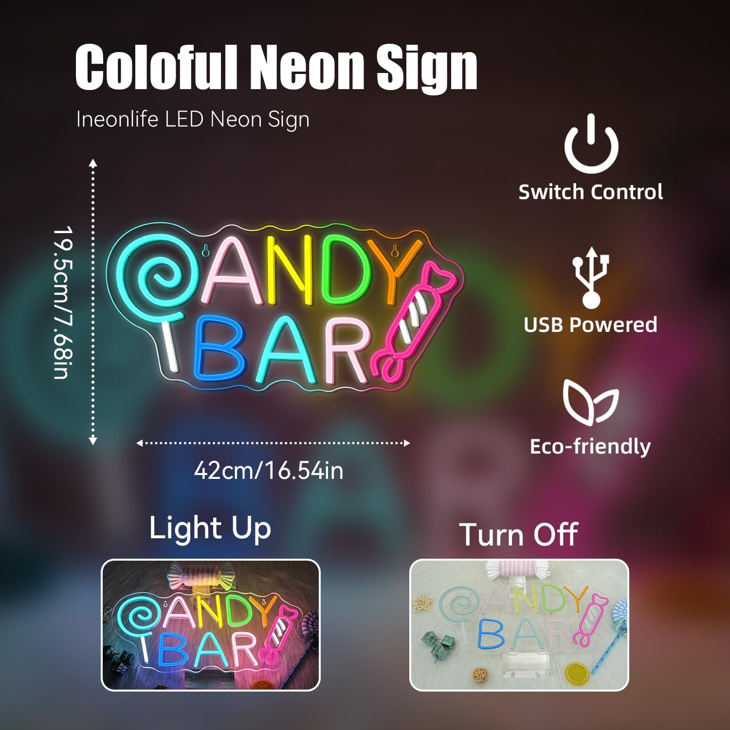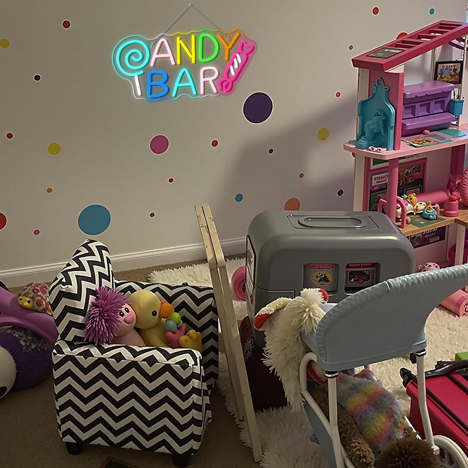 - EYE-CATCHING DESIGN: The neon sign creative mix of lollipop and โCandy Barโ adds a playful charm. The led lights vivid glow fits perfectly with candyland decor, dessert cafes, or birthday setups โ making your candy wall truly pop