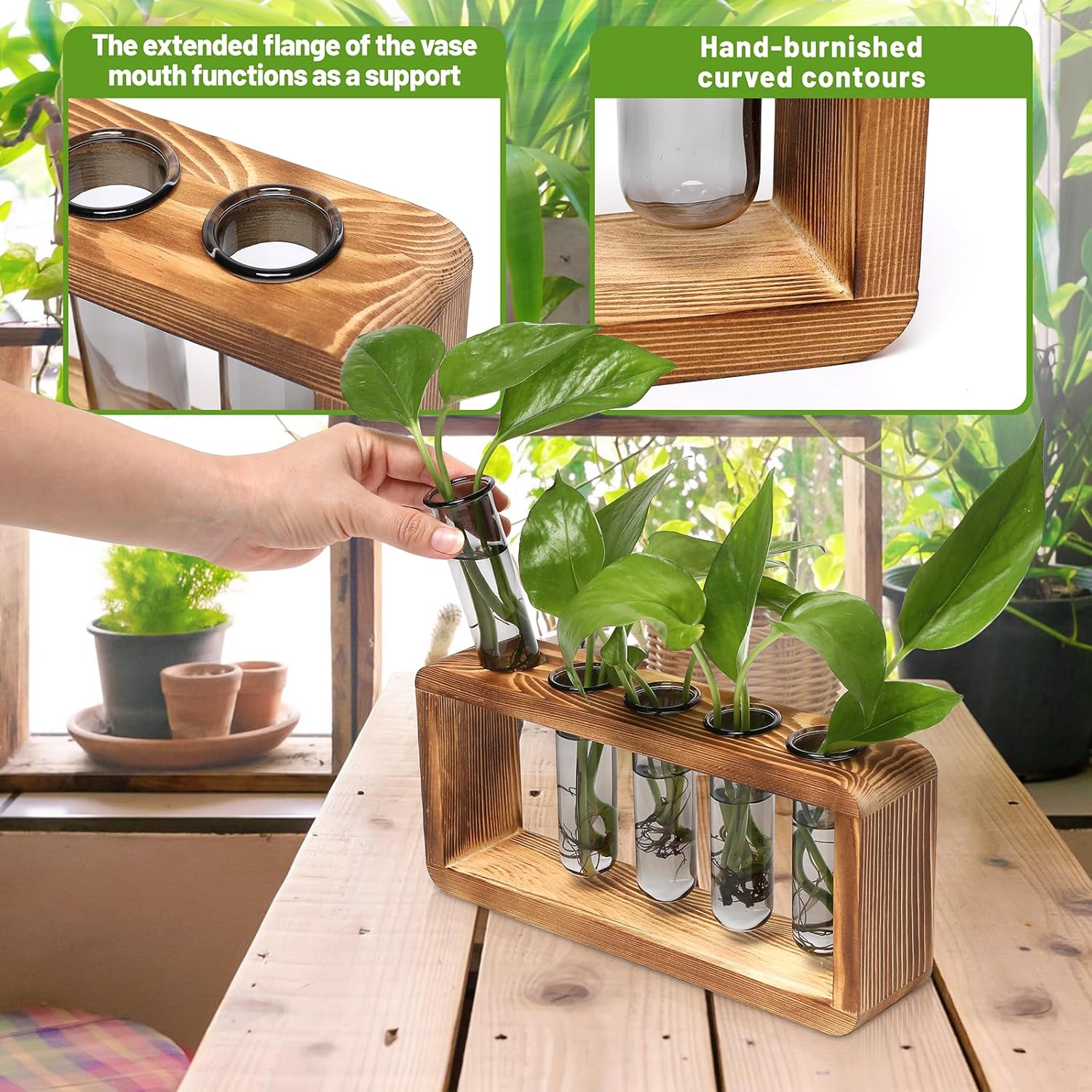 - Natural Materials: Our vintage wooden base and high borosilicate glass vase are made of natural pine wood and odorless materials, providing a safe and healthy solution for your home decoration.