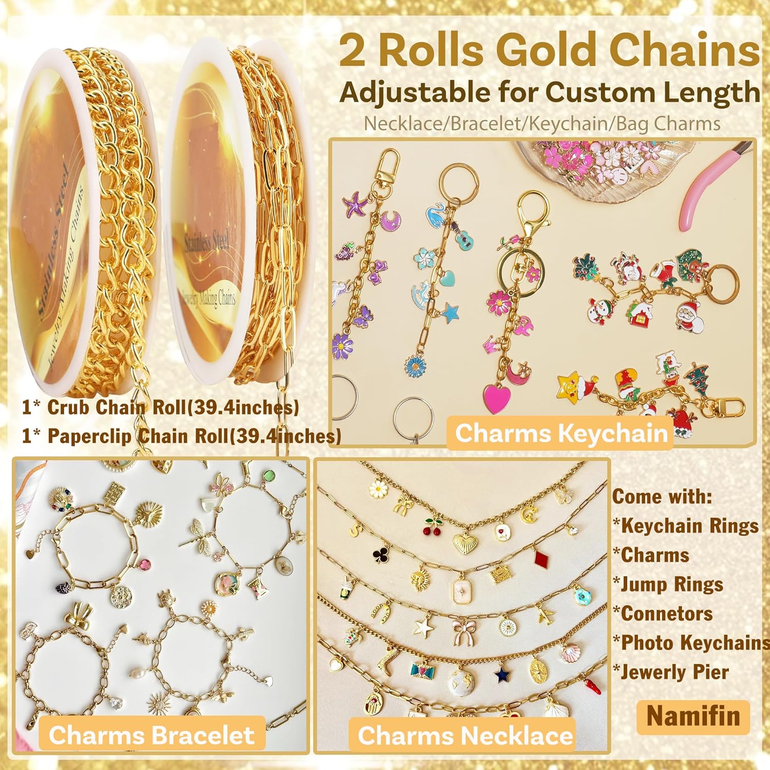 - COMPLETE 384 PCS DIY KEYCHAIN KIT β Includes 112 gold charms (letters, flowers, fruit), 30 keychain clips in 3 styles with rings, 30 lobster clasps, 200 jump rings in 3 sizes (6/7/8mm), 2 rolls of extender chains (65.6 ft total), 1 pink jewelry plier, and 6 photo keychains β all the essentials for creative crafting