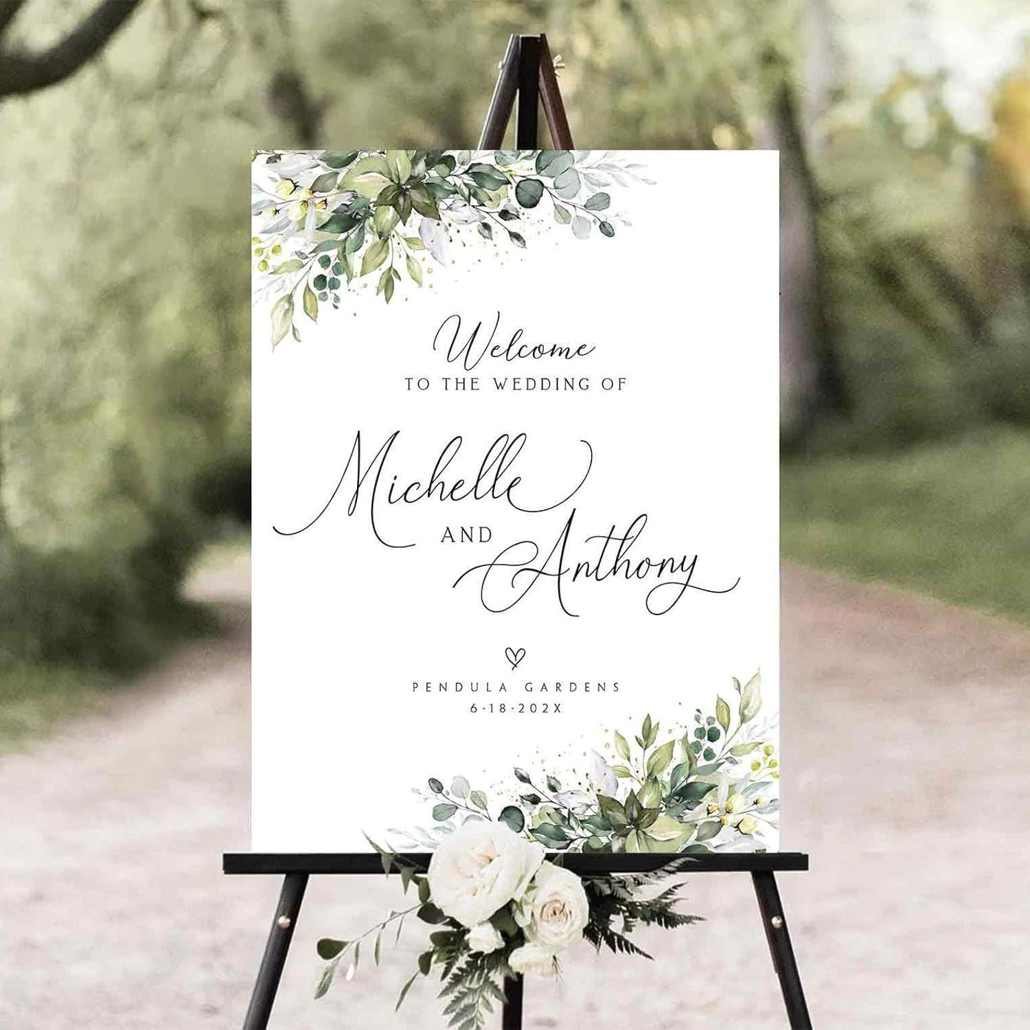 Personalized Wedding Welcome Sign, Greenery Eucalyptus Wedding Sign Signage 12" X 18" (Small), 27" (Medium), 36" (Large), Plastic, Modern, Pole Mount, Weather