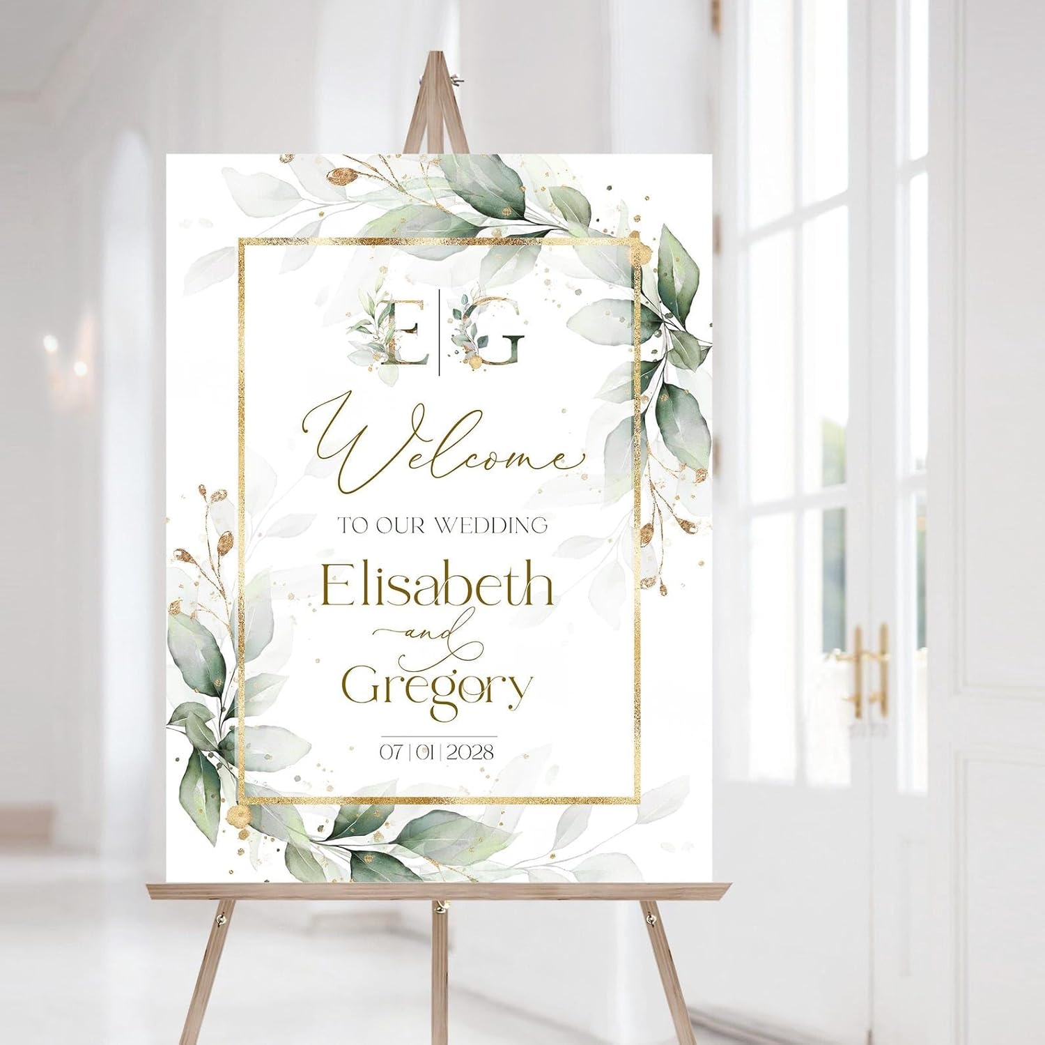 Personalized Wedding Welcome Sign, Greenery Eucalyptus Sage Gold Wedding Sign Signage 12" X 18" (Small), 27" (Medium), 36" (Large), Plastic, Modern, Pole Mount, Weather