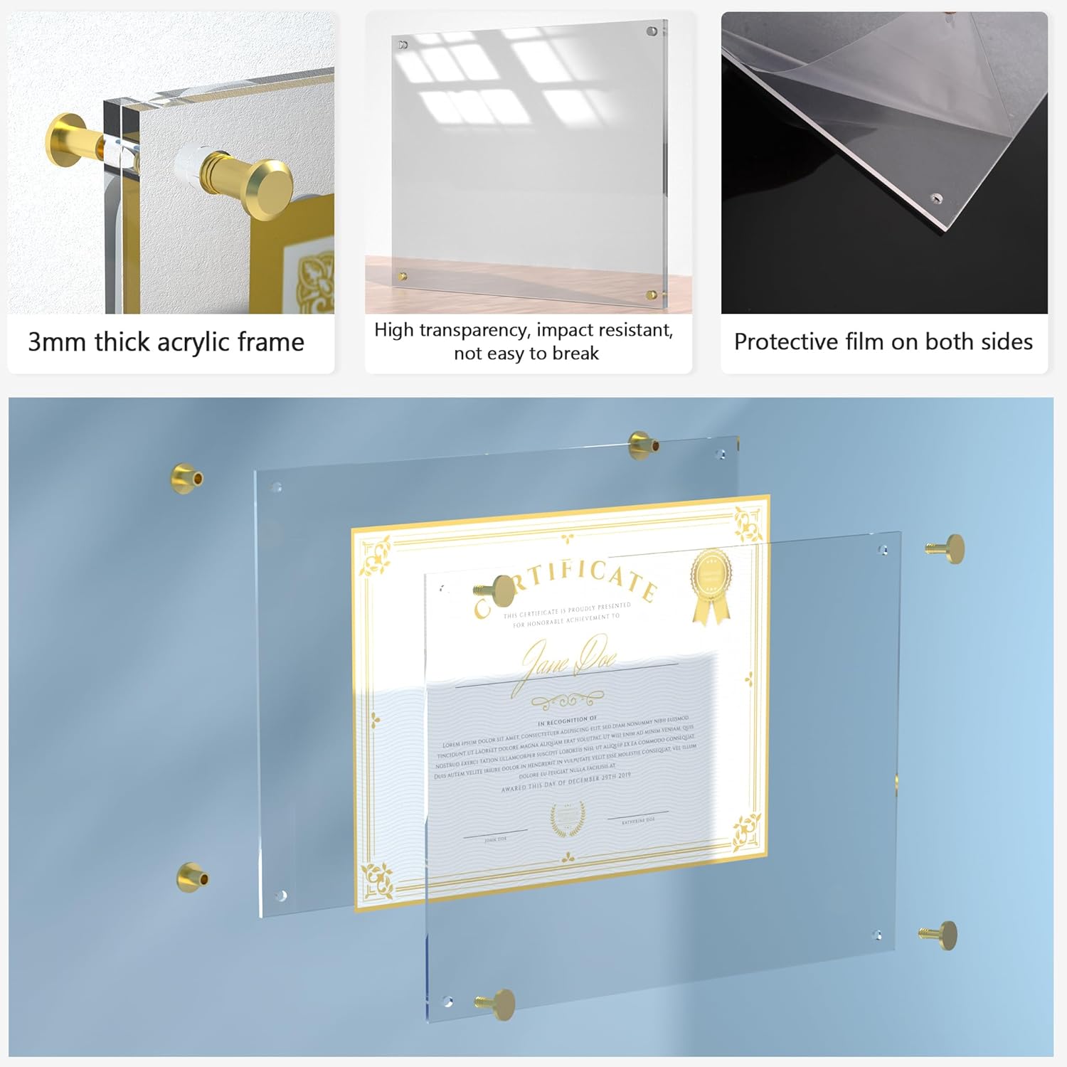 - Modern, Frameless Clarity: Crafted from two 3mm-thick and shatter-resistant acrylic panels, the acrylic frame create an invisible, floating appearance that allows unobstructed view of displayed items with elegant modern aesthetics