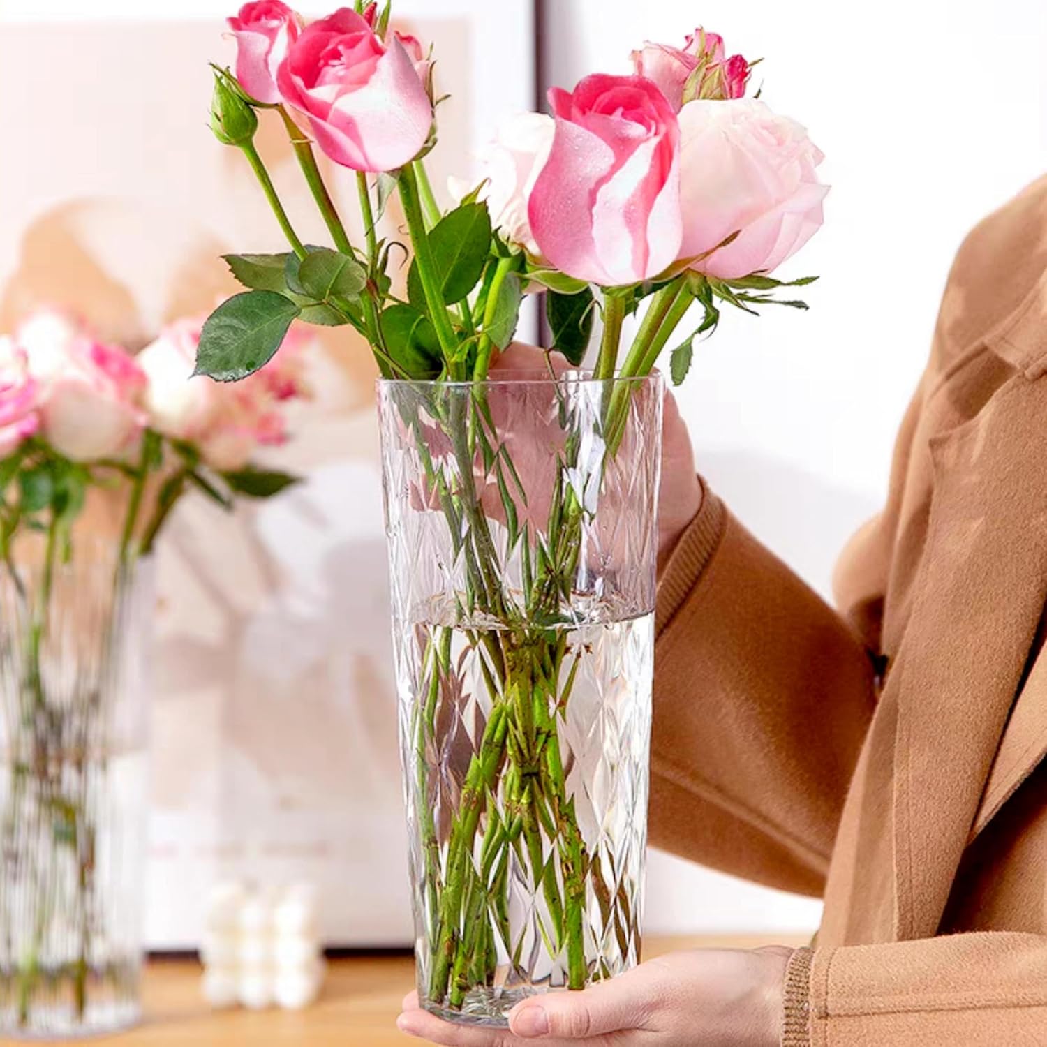 - 🌷【High-quality materials】4-piece set, made of high-quality materials, contains 2 large transparent cylindrical TPE plastic vases + 2 flower stem stands, ensuring durability, these vases are not easy to break, and the spiral flower stem stands are also suitable for creative flower arrangements. Providing endless possibilities, you can confidently display your beautiful flower arrangements without worrying about accidents or damage.