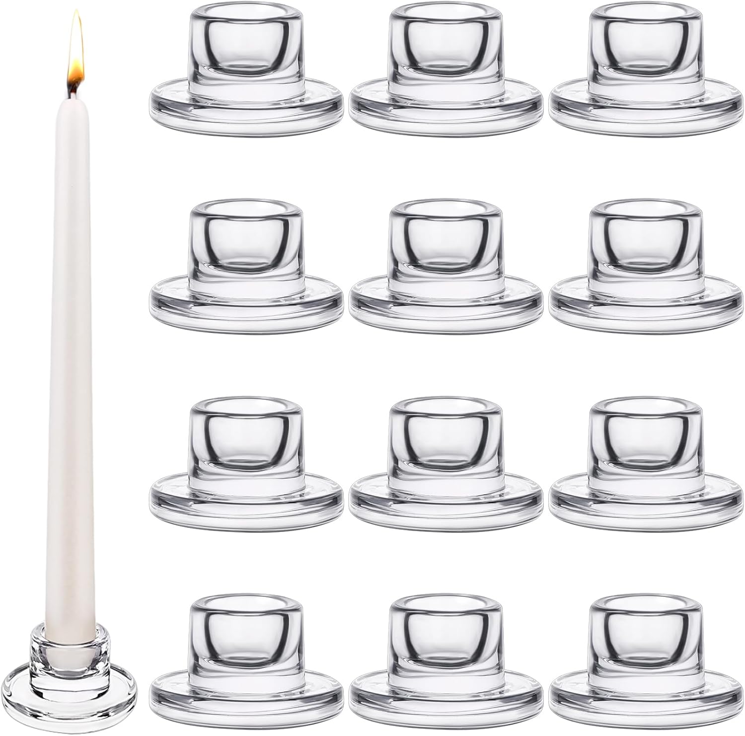 12 PCS Glass Taper Candle Holders Bulk Candlestick Holders Clear Short Tapered Candle Stick Holder Decor Set for Table Centerpiece Wedding Party Advent Christmas Home Decorations (12, Clear)