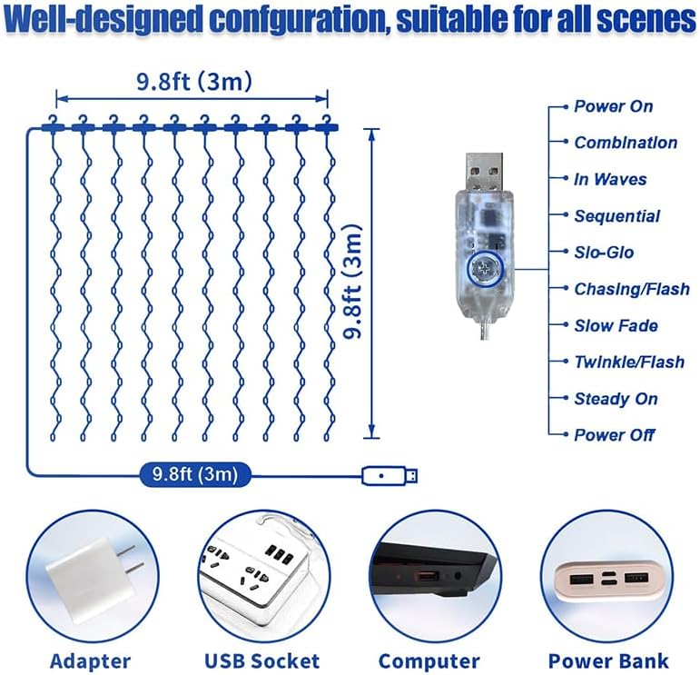 - 🎛️ 【Remote Control with 8 Modes & Timer - Perfect Christmas Decorations】 Take full remote control of your ambiance! This led curtain lights features 8 lighting modes (Combination, Waves, Sequential, Slow Fade, etc.) and adjustable brightness. The 6H/18H auto timer offers ultimate convenience for christmas decorations, bedroom decor, and daily cozy home decor, making it a top value for money choice.