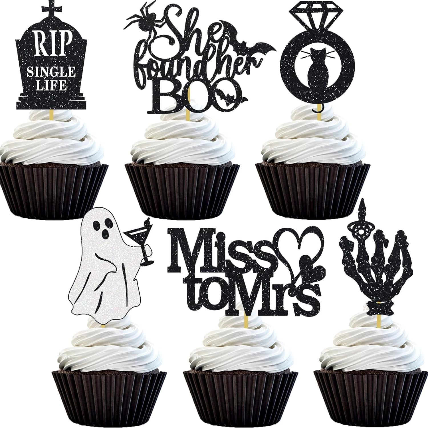 - Miss to Mrs bachelorette party: 4 pcs she found her boo spider bat cupcake toppers, 4 pcs rip single life cupcake toppers, 4 pcs skeleton hand cupcake toppers, 4 pcs boo with martini glass cupcake toppers, 4 pcs black cat ring cupcake toppers,4 pcs miss to Mrs cupcake toppers
